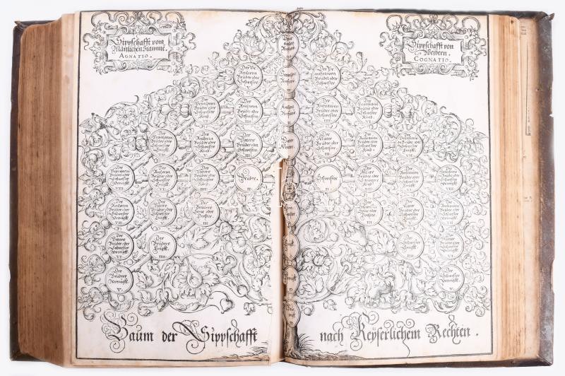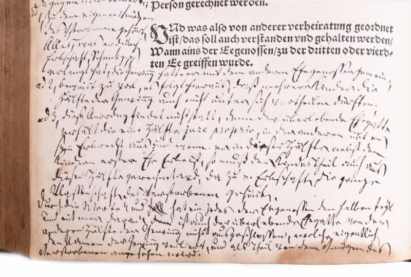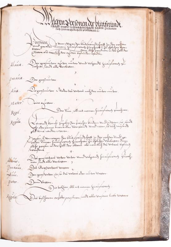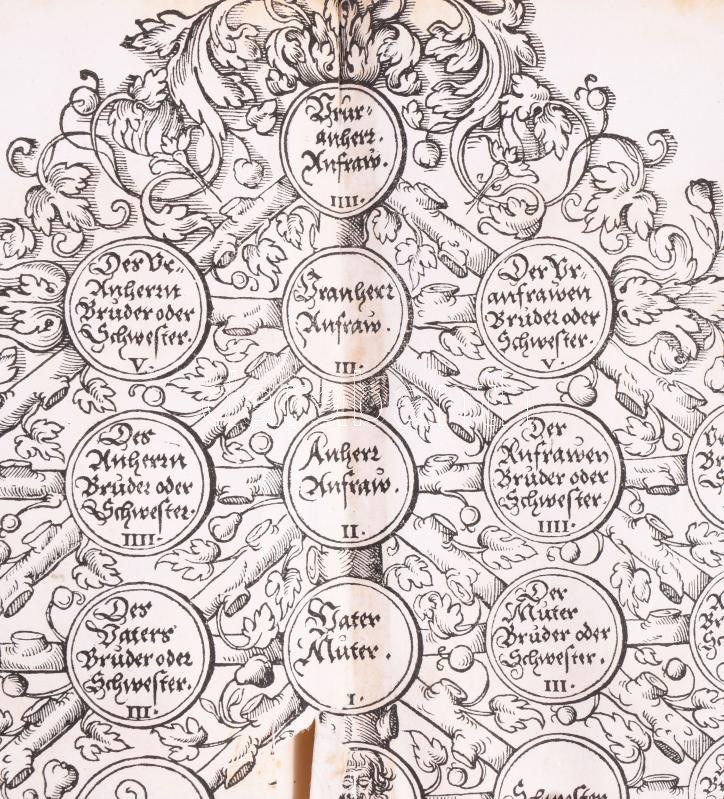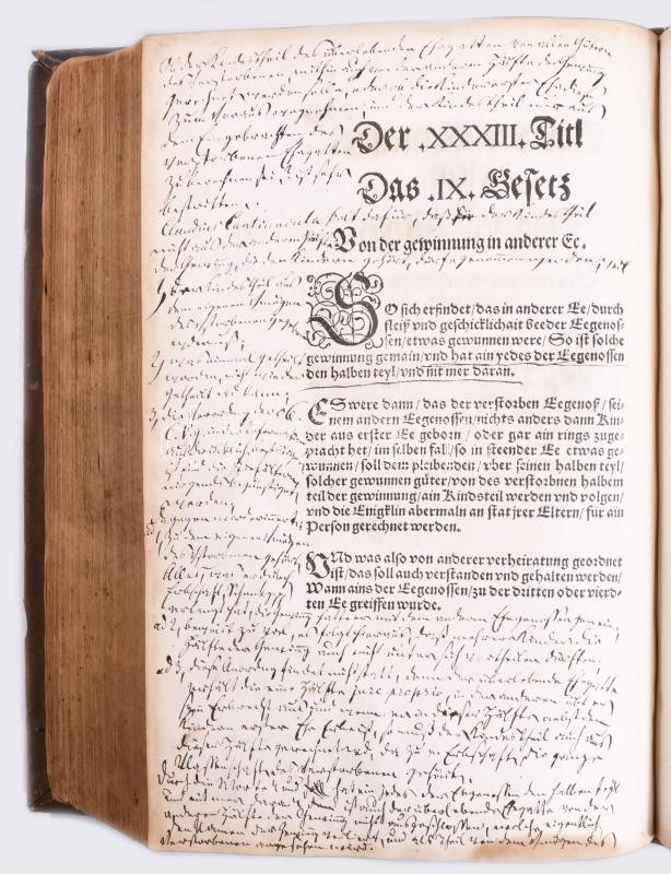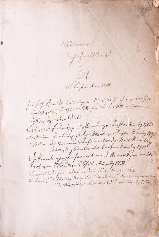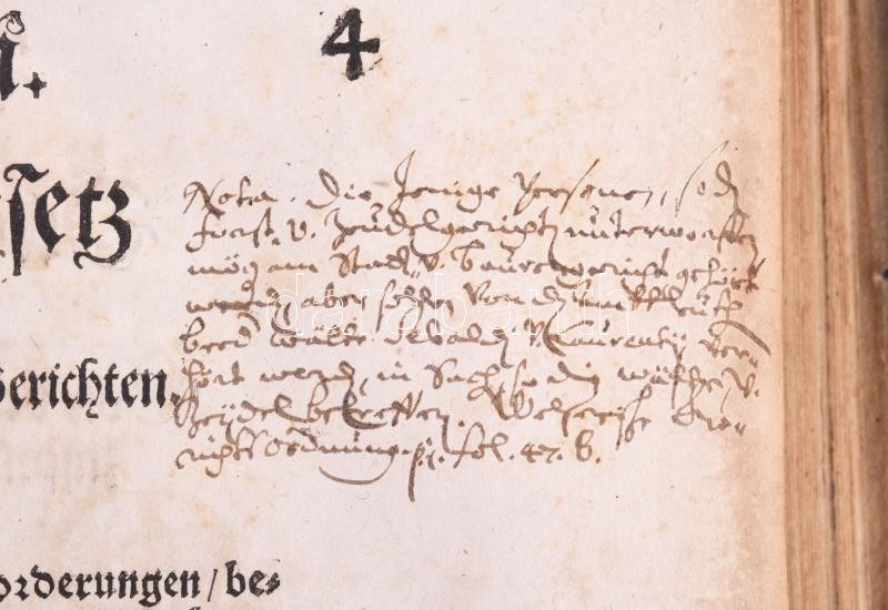 Der Stat Nürmberg verneute Reformation. Nürmberg [Nürnberg], 1564, Valentin Geißler, 1 (fametszetű díszcímlap) t.+ 2 sztl. lev.+1 (fametszet) t.+40 sztl. lev.+240 lev.+1+1+ 31 [korabeli kézzel írt jegyzetlapok] t. + 1 (fametszetű ábra, sérült) t. Német nyelven. Benne XVIII. század végi folyóiratokkal: 1777-1789 Friedens- und Kriegs-Kurier 3 száma (Num. CCLX (1777. okt. 30), Num. CXVI (1783. május 15.), Num. CLXXXII (1789. július 31.) Nürnberg, 1777-1789, Paul Jonathan Felßecker,német nyelven. 3x2 sztl. lev. Eredeti XVI. századi egészbőr-kötésben, kötéstáblákon keretben: körben növényi ornamentikus díszítéssel, utána szintén körbe figurális díszítésekkel, alattuk feliratokkal, utánuk növénydíszes ornamentkában medalionokkal, bennük arcképekkel, végül szintén növényi ornamentikával, továbbá a borítón keretben "Reformation" és "1564" feliratokkal, kopott, foltos borítóval, a borítón karcolásokkal, és apró lyukakkal, a fém kapcsok hiányoznak, a hátsó táblán (a hiányzó kapcsok mentén), a gerinc felső részén, és a felső sarkokon sérülésekkel, a címlap felső sarkán hiánnyal, a legutolsó lap és a metszet (222-223. lev között) sérült, az elülső szennylapon kis sérüléssel, rajta több korszakból származó bejegyzésekkel, foltos lapokkal, a lapokon bejegyzésekkel, jegyzetekkel, (felthetőleg egy kéz munkái kb. a XVI. sz. végéről/XVII. sz. elejéről), a könyv végén egy kéz általi jegyzetekkel (feltehetőleg XVI. sz. vége/XVII. sz. eleje.) Modern védőtokban, belül bársony védőborítással. Rendkívül ritka, a borítója igazi műremek!