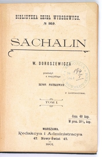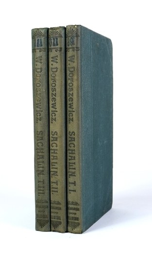 DOROSZEWICZ W[las] - Sachalin. Przeł. z rosyjskiego Zenon Pietkiewicz. (Z ilustracyami). T. 1-3. Warszawa 1901. Druk. A. T. Jezierskiego. 16d, s. 152, [8]; 159; 160. opr. oryg. pł. Bibliot. Dzieł Wyborowych, nr 169-171.