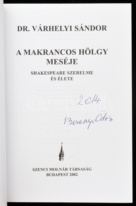Dr. Várhelyi Sándor: A makrancos hölgy meséje. Shakespeare szerelme és élete. Bp., 2002, Szenci Molnár Társaság. Kiadói papírkötés, jó állapotban. A könyv támogatója, Berényi Ödön által aláírt példány.