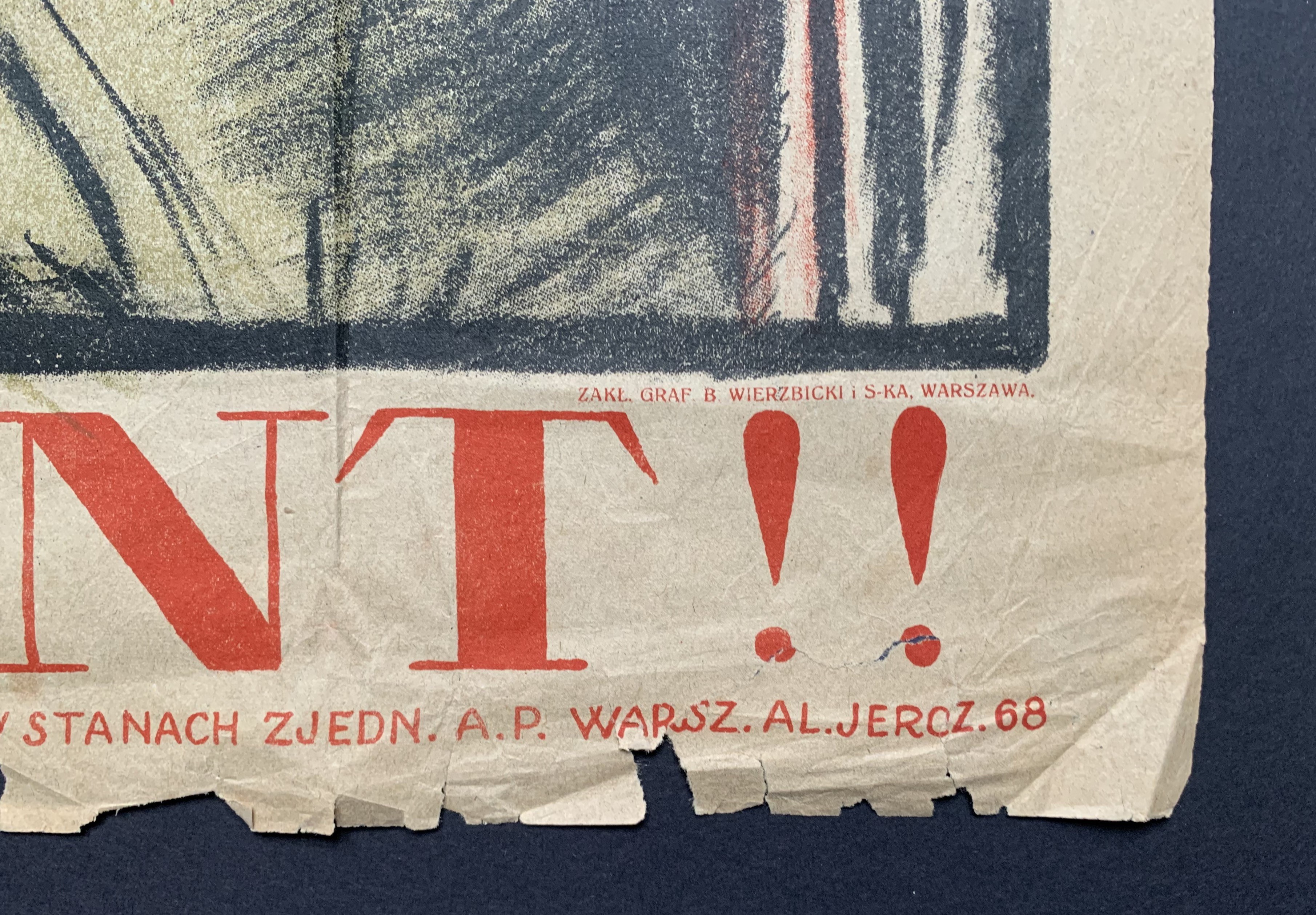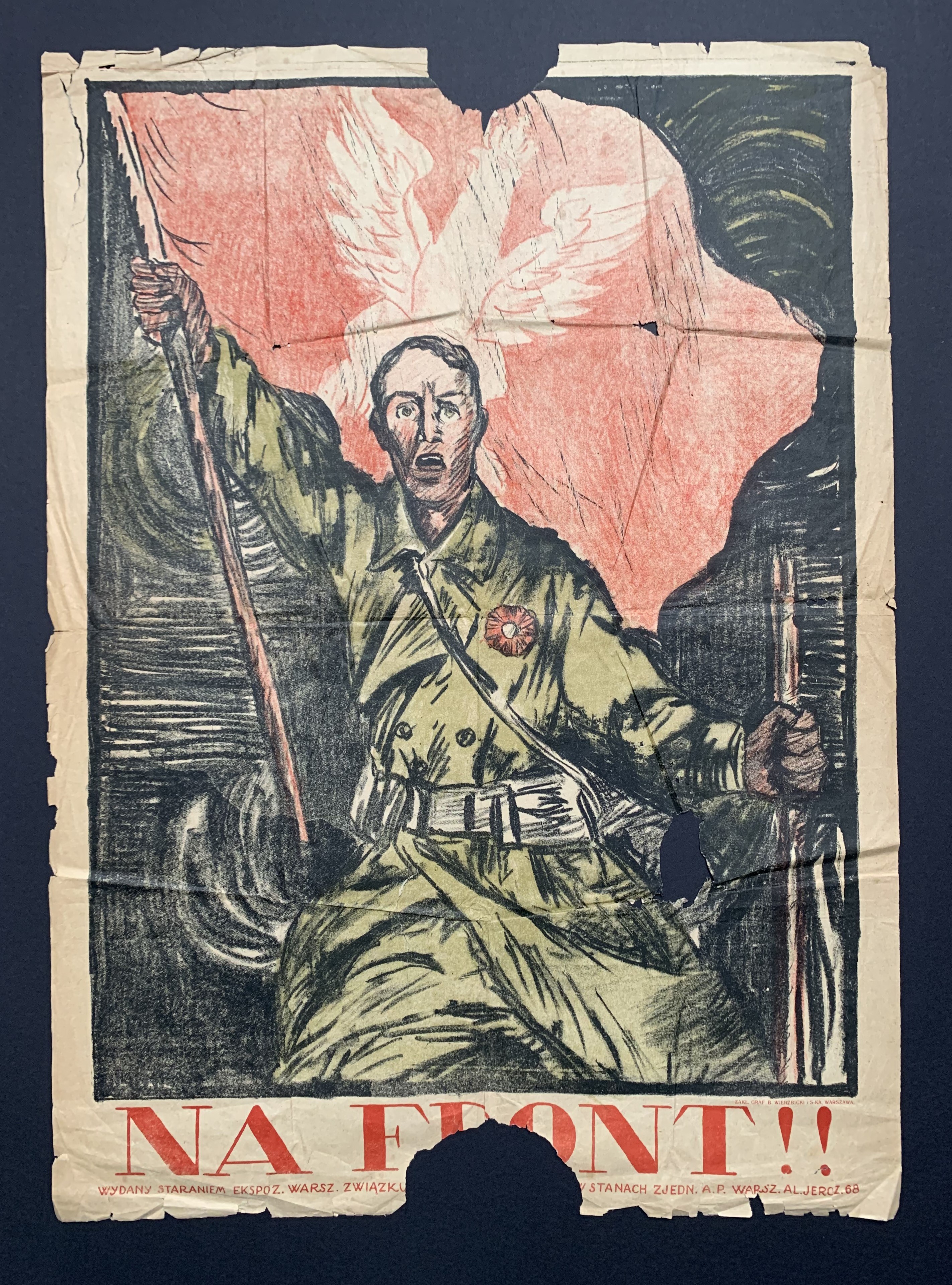 Plakat wojskowy z wojny polsko-bolszewickiej ["Poland first to fight" - katalog polskiego plakatu wojskowego. Agencja Wydawnicza CB Andrzej Zasieczny. Warszawa 200] autorstwa Witolda Gordona [1885-1968] - polski malarz tworzący w Stanach Zjednoczonych. Wyjechał do Paryża, gdzie uczył się w École des Beaux-Arts. Po zakończeniu edukacji wyjechał do Nowego Jorku gdzie w roku 1932 zrealizował m.in. dwa główne malowidła ścienne w Radio City Music Hall oraz plakat na Igrzyska Olimpijskie w Lake Placid. W 1939 stworzył malowidło wielkości 6000 stóp na budynku New York World’s Fair, praca ta była wielokrotnie reprodukowana na plakatach i pocztówkach. W tym samym roku odbył podróż artystyczną po południowych stanach, owocem tej podróży było 35 gwaszy noszących wspólny tytuł „American Scene” i została wystawiona w lutym 1941 w Muzeum Sztuki Nowoczesnej. Wystawa została bardzo dobrze przyjęta, a magazyn Vogue zamieścił pozytywne recenzje. W połowie lat 40. otrzymał zamówienie z New Yorker na zaprojektowanie okładek przedstawiających dawny Nowy Jork. W 1949 ponownie podróżował po południowych stanach, gdzie tworzył kontynuację cyklu „American Scene”.