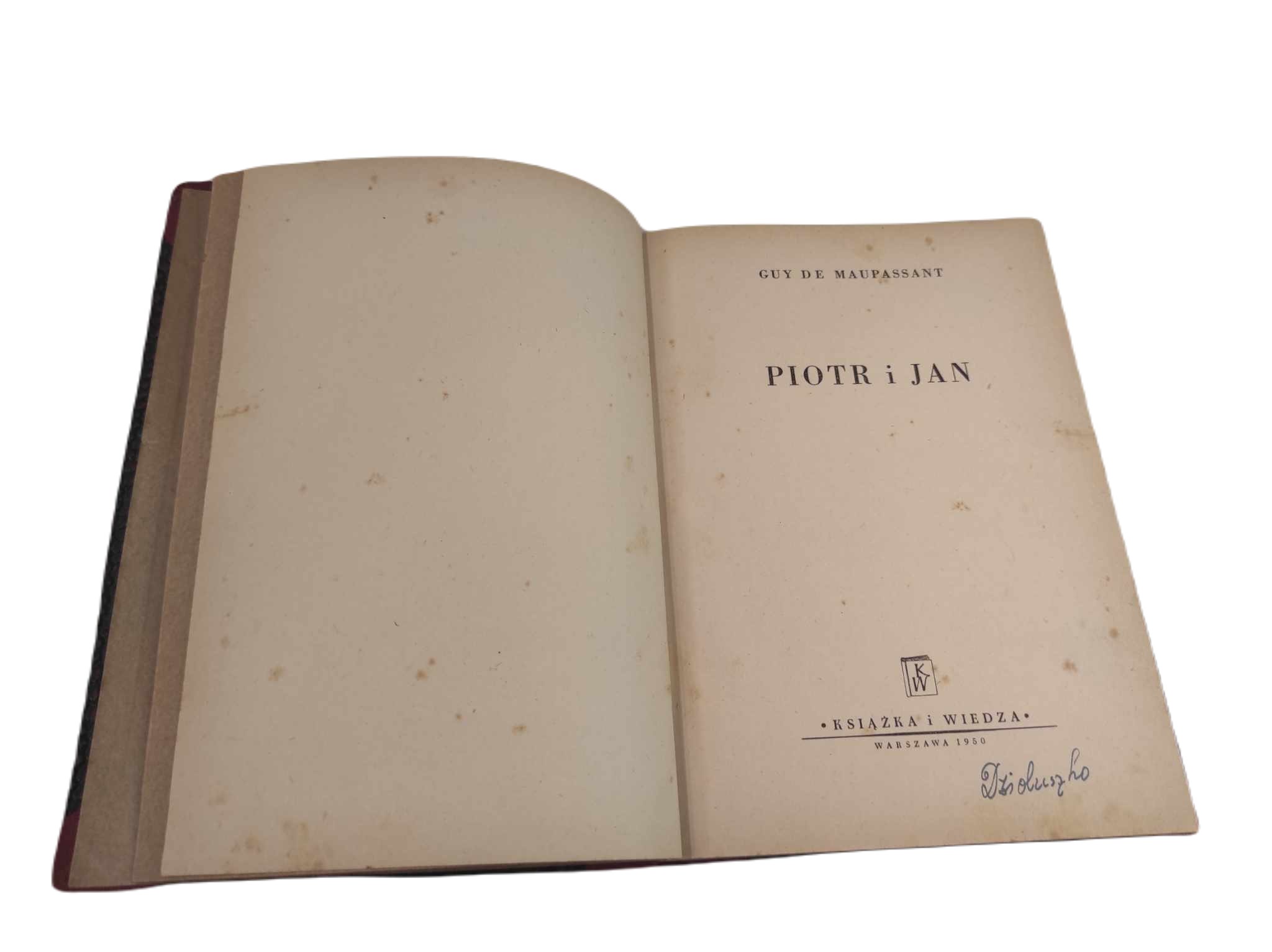 Guy de MAUPASSANT Piotr i Jan Warszawa 1950 Książka i Wiedza 143, [1 s. o. półpłócienna s. db, foxing, podpis właść. For. ca: 21x15,5 cm |