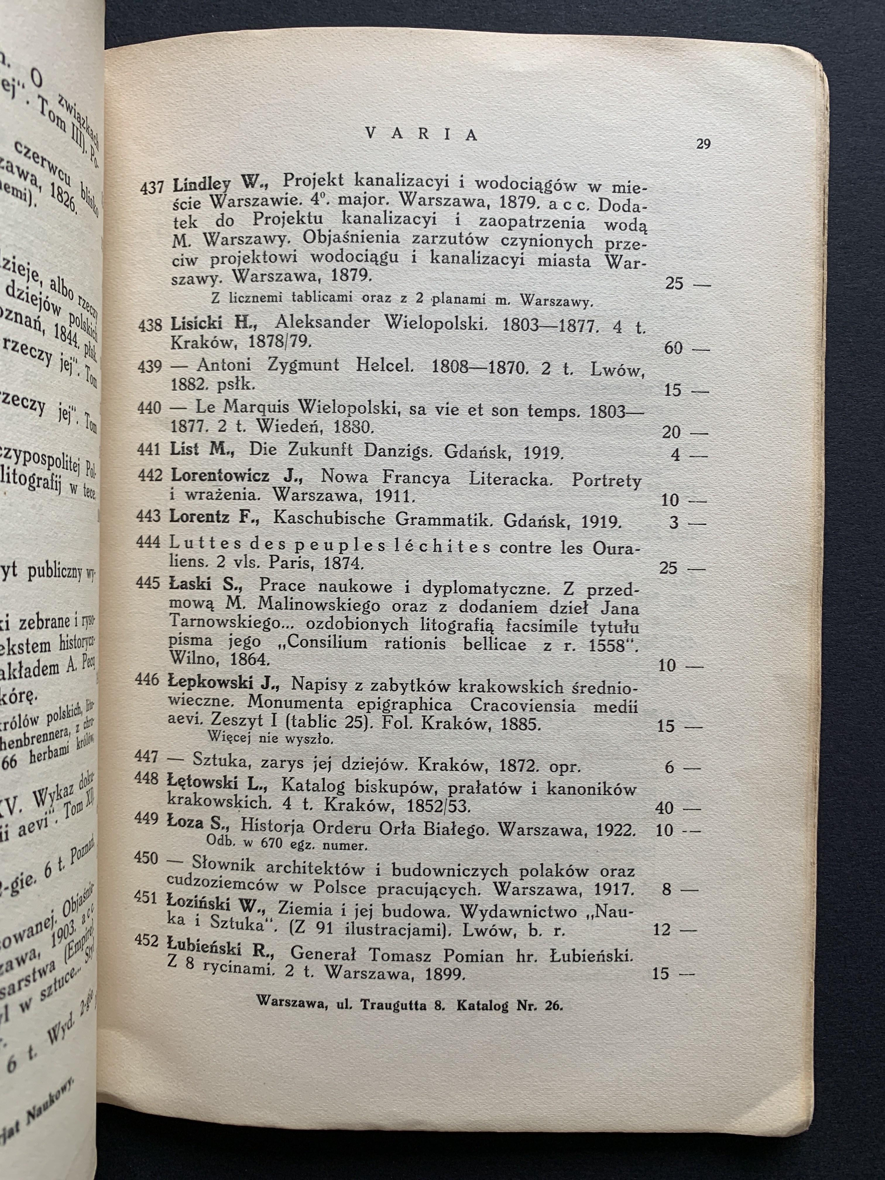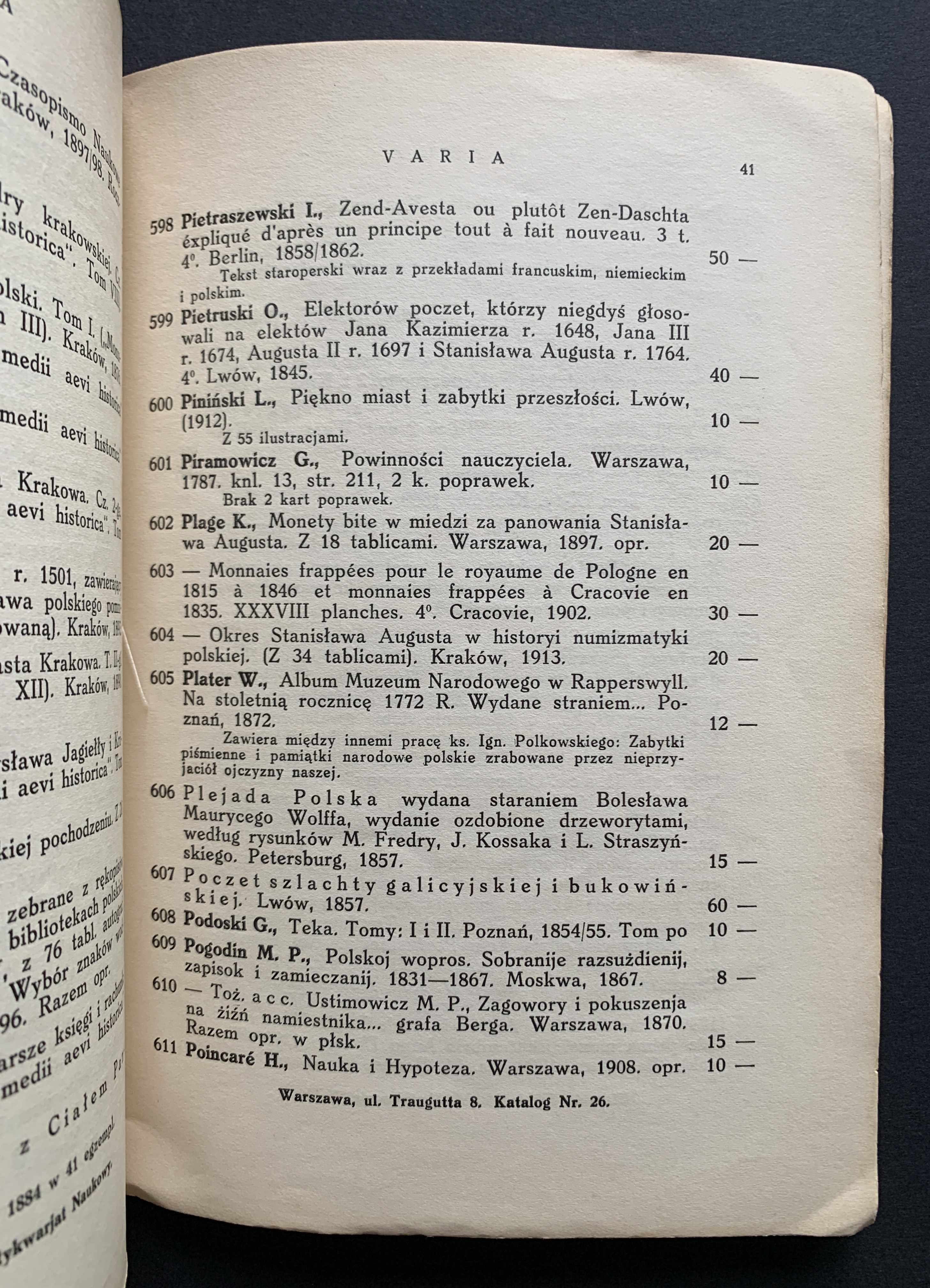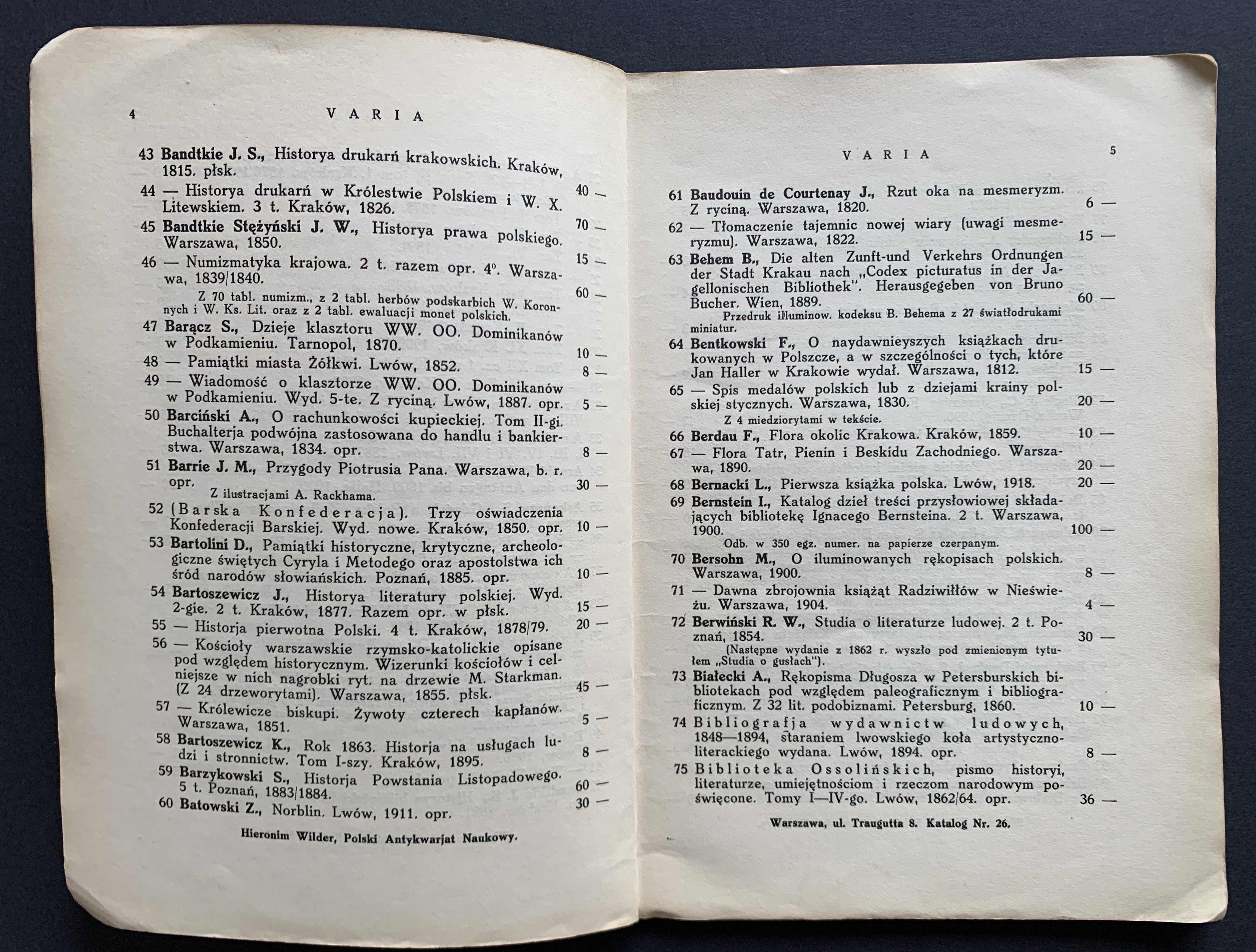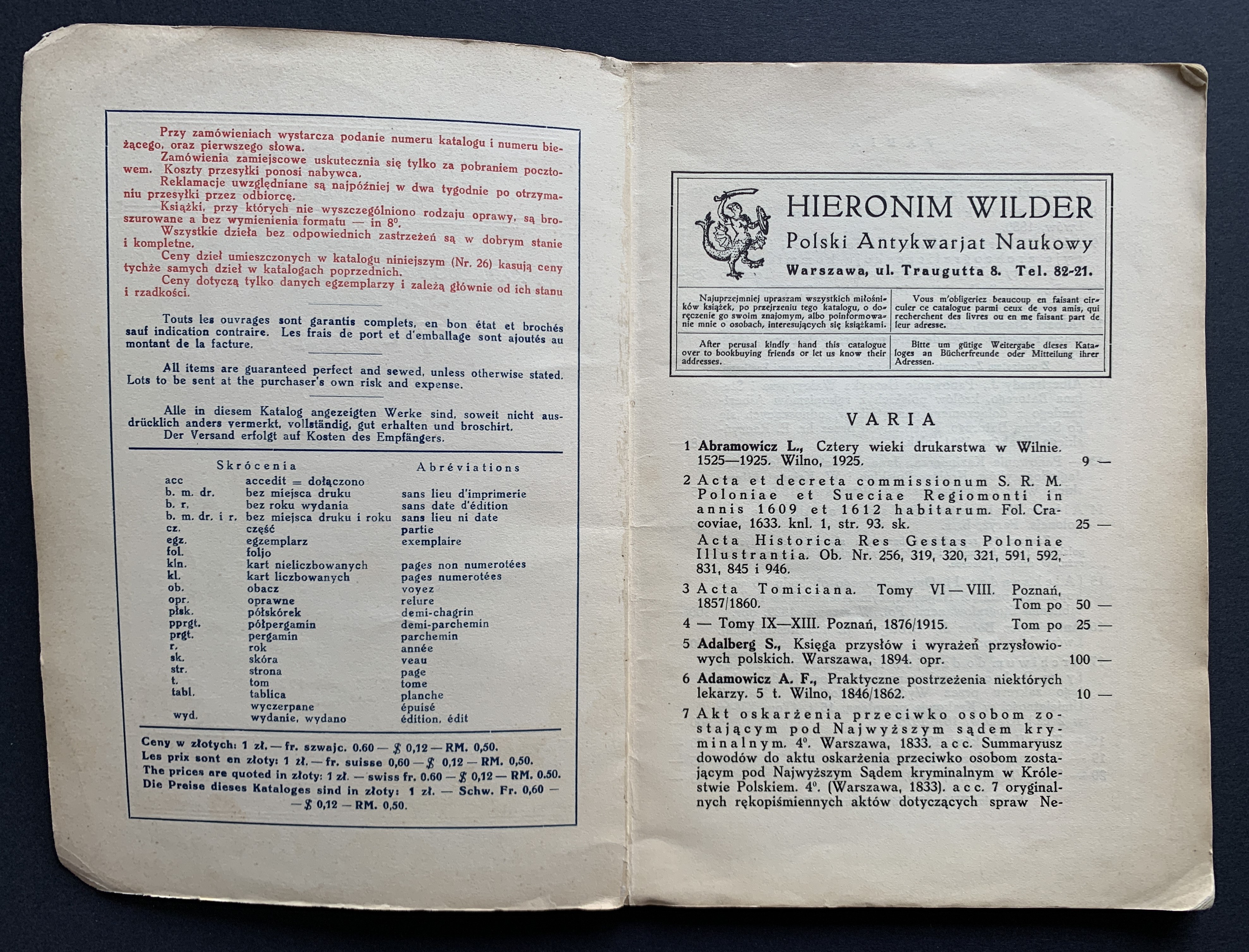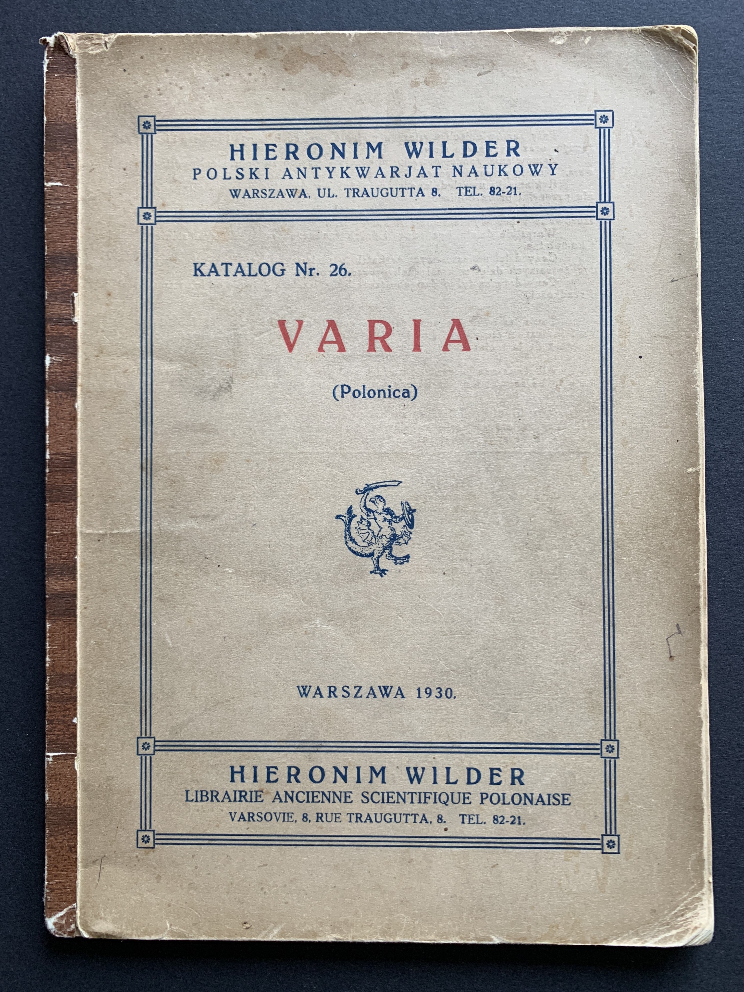 KATALOG Nr. 26. VARIA [Polonica]. HIERONIM WILDER POLSKI ANTYKWARJAT NAUKOWY WARSZAWA, UL. TRAUGUTTA 8. WARSZAWA 1930.
