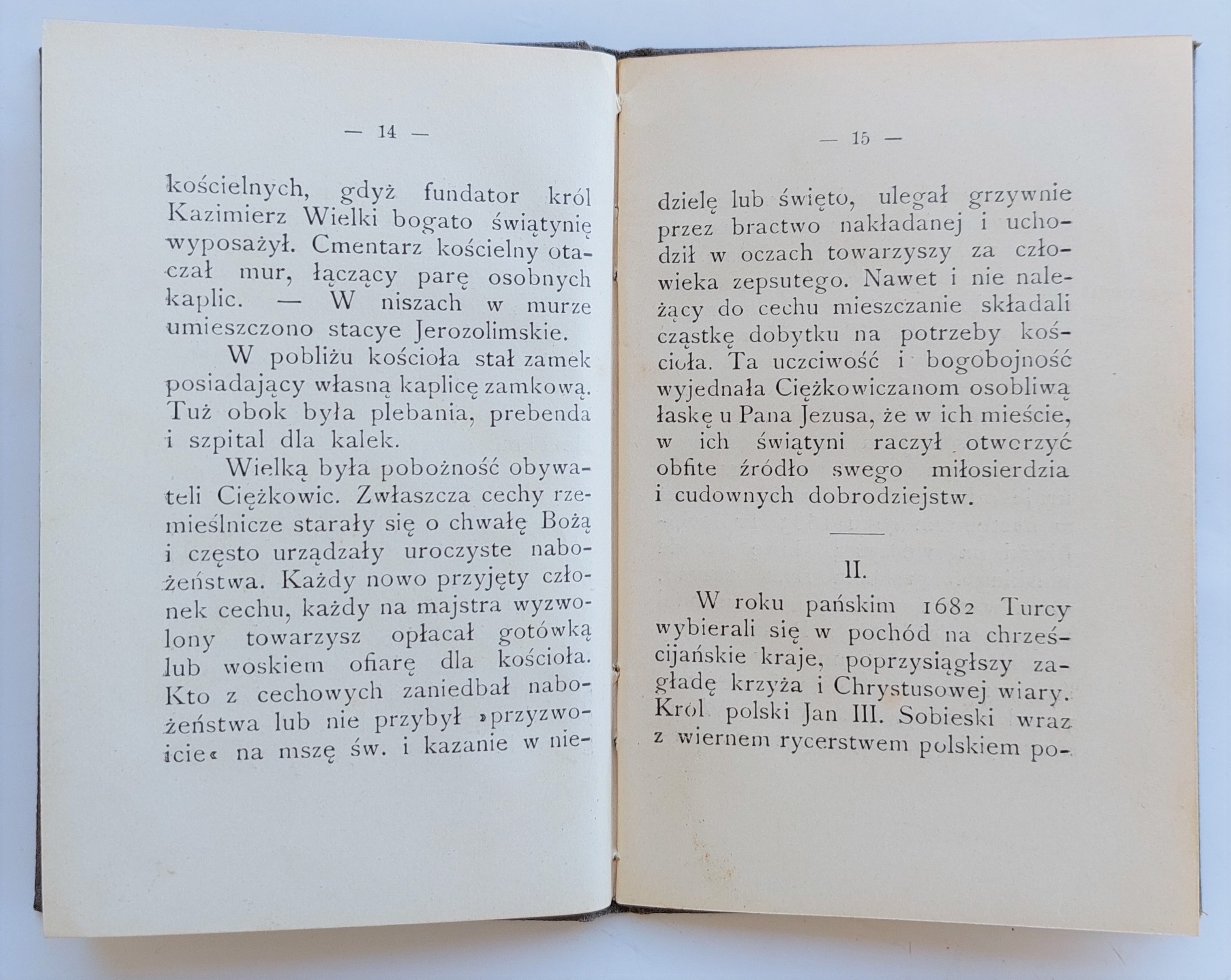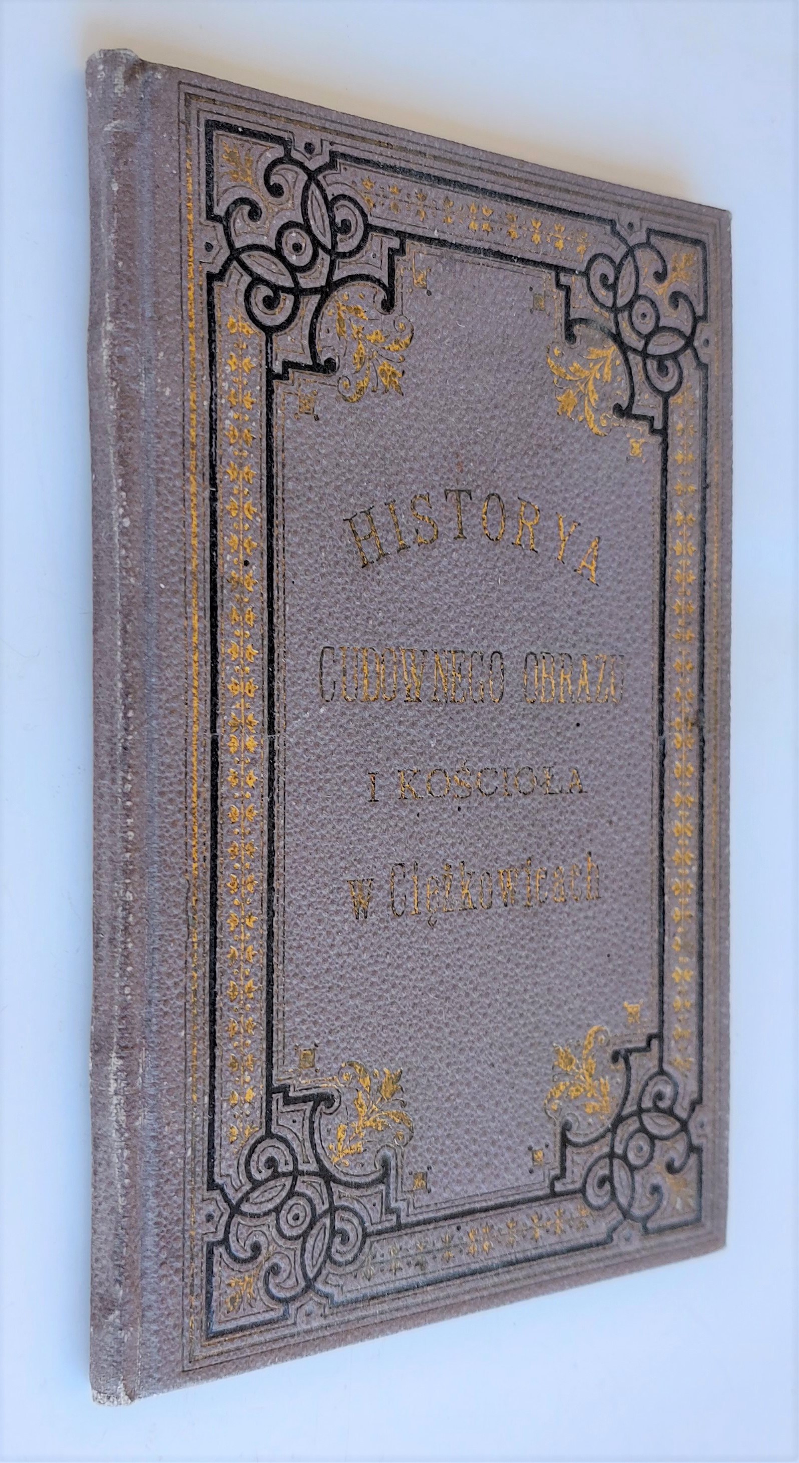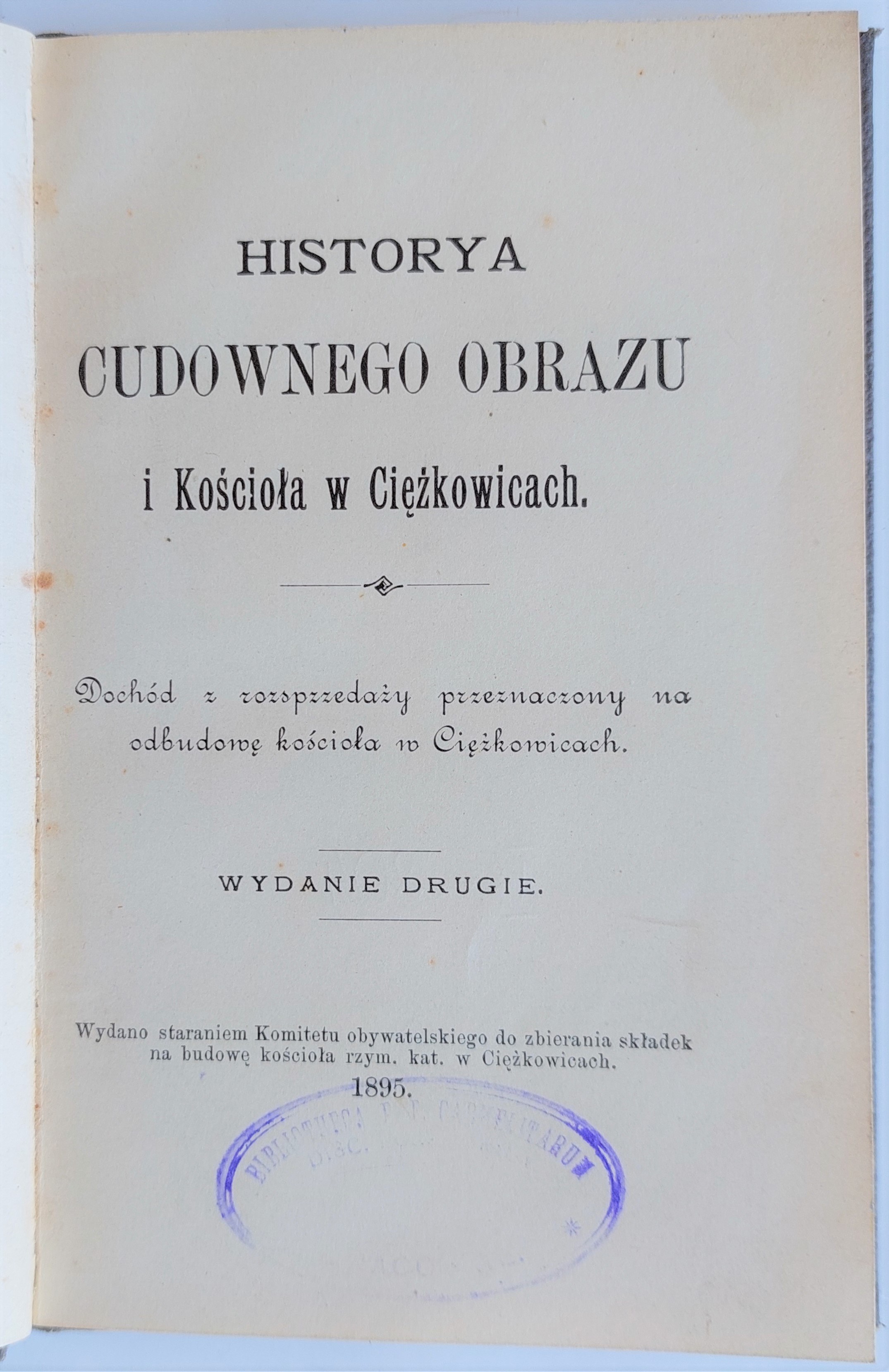 Oprawa wydawnicza, płótno zdobione. Na przedniej wyklejce pieczątka Komitetu Obywatelskiego do zbierania składek na budowę kościoła w Ciężkowicach oraz odręczna dedykacja opatrzona podpisami członków Komitetu.