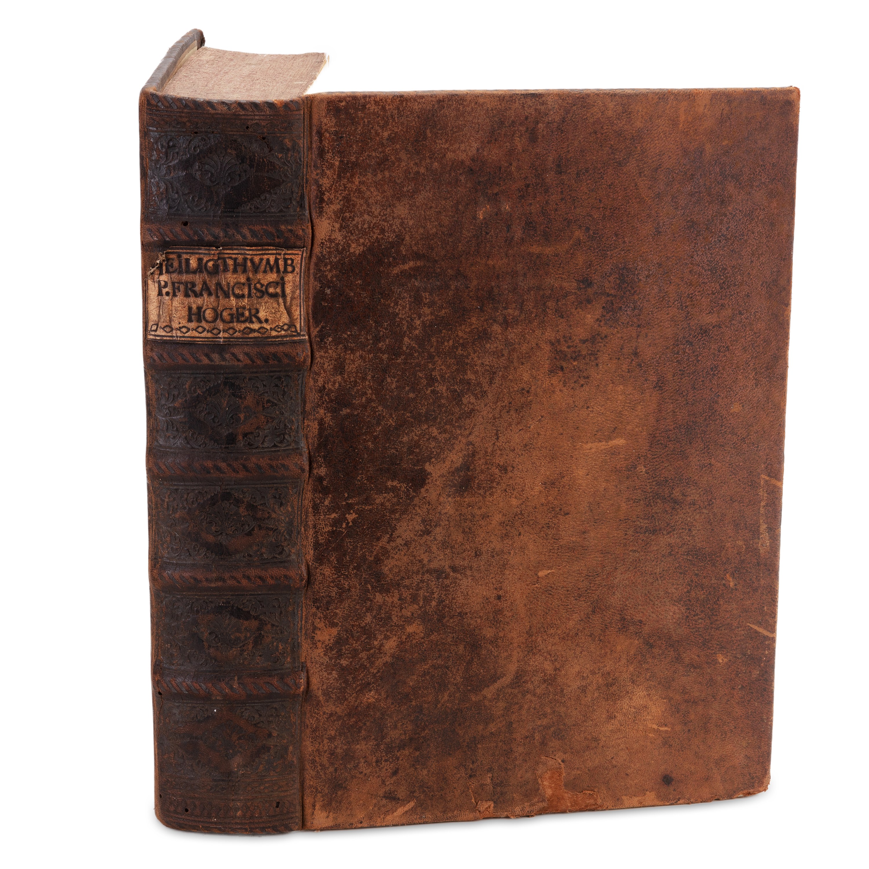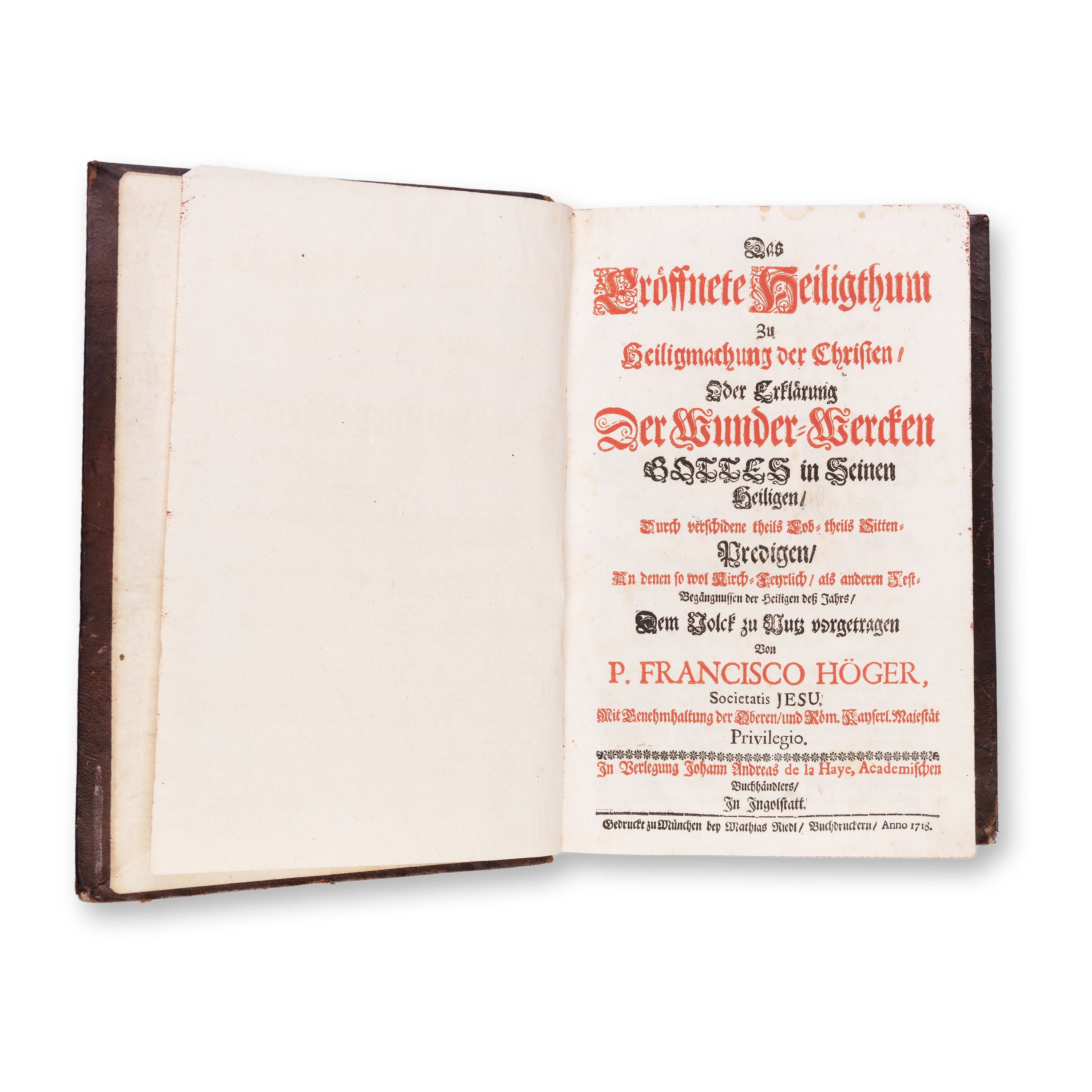 1718 | PUBLISHER: Ingolstatt, Johann Andreas de la Haye | NUMBER OF PAGES: 724 + index | LANGUAGE: German | DIMENSIONS: 318 x 225 mm | THE FULL TITLE OF THE WORK: Das Eroffnete Heiligthum, Zu Heiligmachung der Christen, Oder Erklarung der Wunder - Wercken Gottes in seinen Heiligen, Durch verschiedene theils Lob - theils Sitten - Predigen | CONDITION: light insect damage, spots
