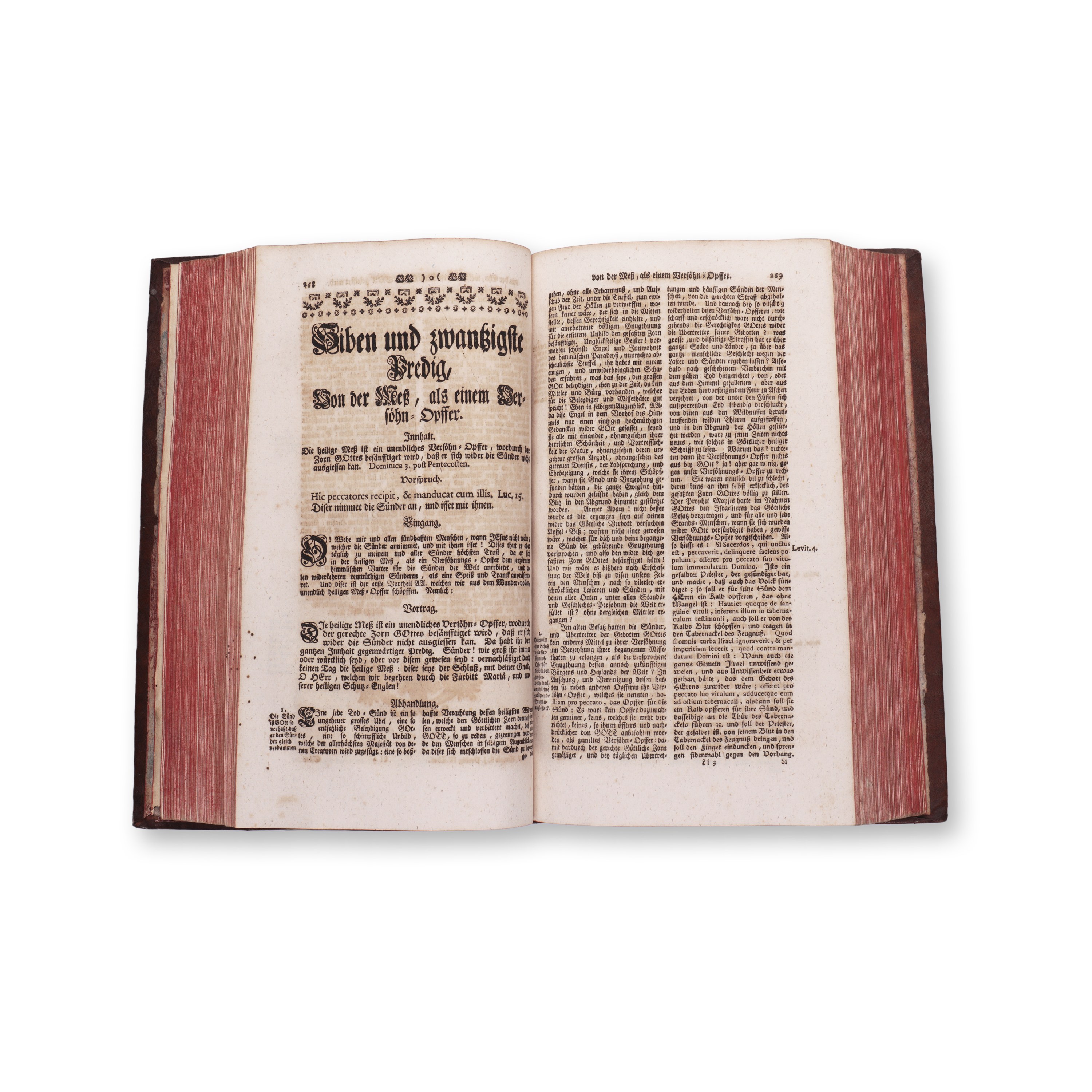1765 | PUBLISHER: Augsburg, Ignaz Adam und Franz Anton Veith | NUMBER OF PAGES: 730 + index | LANGUAGE: German | DIMENSIONS: 346 x 225 mm | THE FULL TITLE OF THE WORK: Christliche Sittenlehre ueber die evangelischen Wahrheiten dem christlichen Volke in Sonn - , Festtags - und Gelegenheits - Predigten auf offentlicher Cantzel vorgetragen. Vierter Theil | CONDITION: insect damage, spots