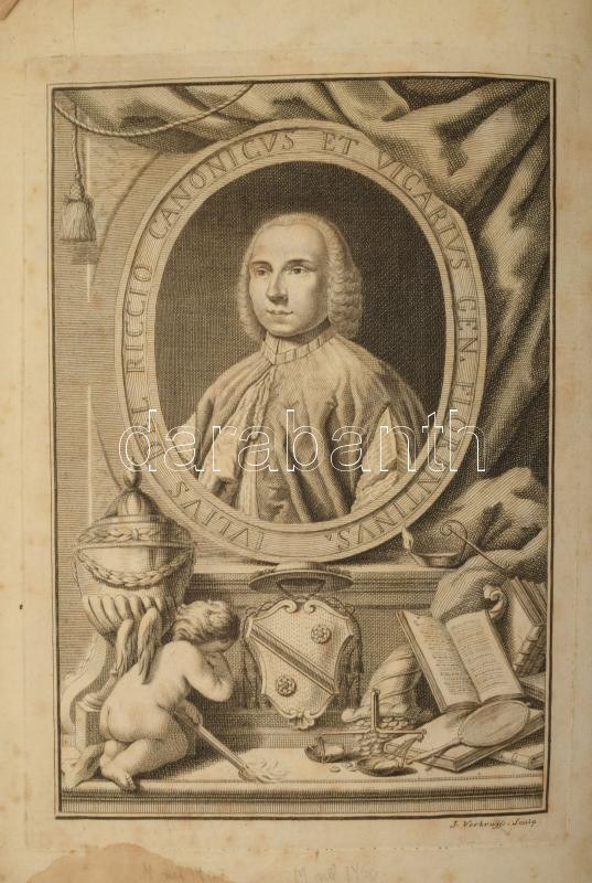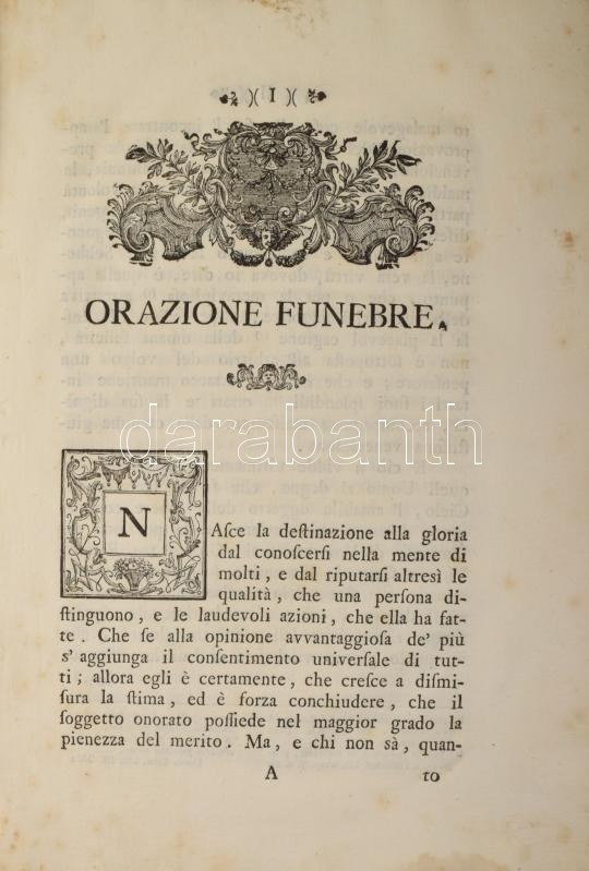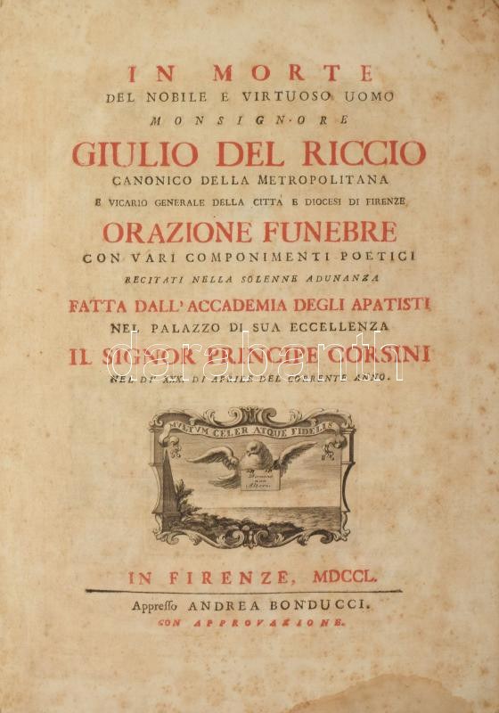 In morte del nobile e virtuoso uomo monsignore Giulio del Riccio canonico della metropolitana e vicario generale della citta e diocesi di Firenze Orazione Funebre con vari componimenti poetici recitati nella solenne adunanza Fatta dall'Accademia degli Apatisti nel palazzo di sua eccellenza Il Signor Principe Corsini nel di' XXX. di aprile del corrente anno. In Firenze, 1750., Appresso Andrea Bonducci, 1 t.+XII+I-LVIII+LXV-LXXX p. Olasz nyelven. Giulio Del Riccio (1702-1750) firenzei püspöki helynök (generalis vicarius) elhunytára írt emlékirat, vers. Korabeli papírkötésben, négy lap hiánnyal (XII-I között, LIX/LX, LXI/LXII, LXIII/LXIV p.), foltos lapokkal. / Paperbinding, four pages lost (between XII - XI, LIX/LX, LXI/LXII, LXIII/LXIV p.), spotty pages.