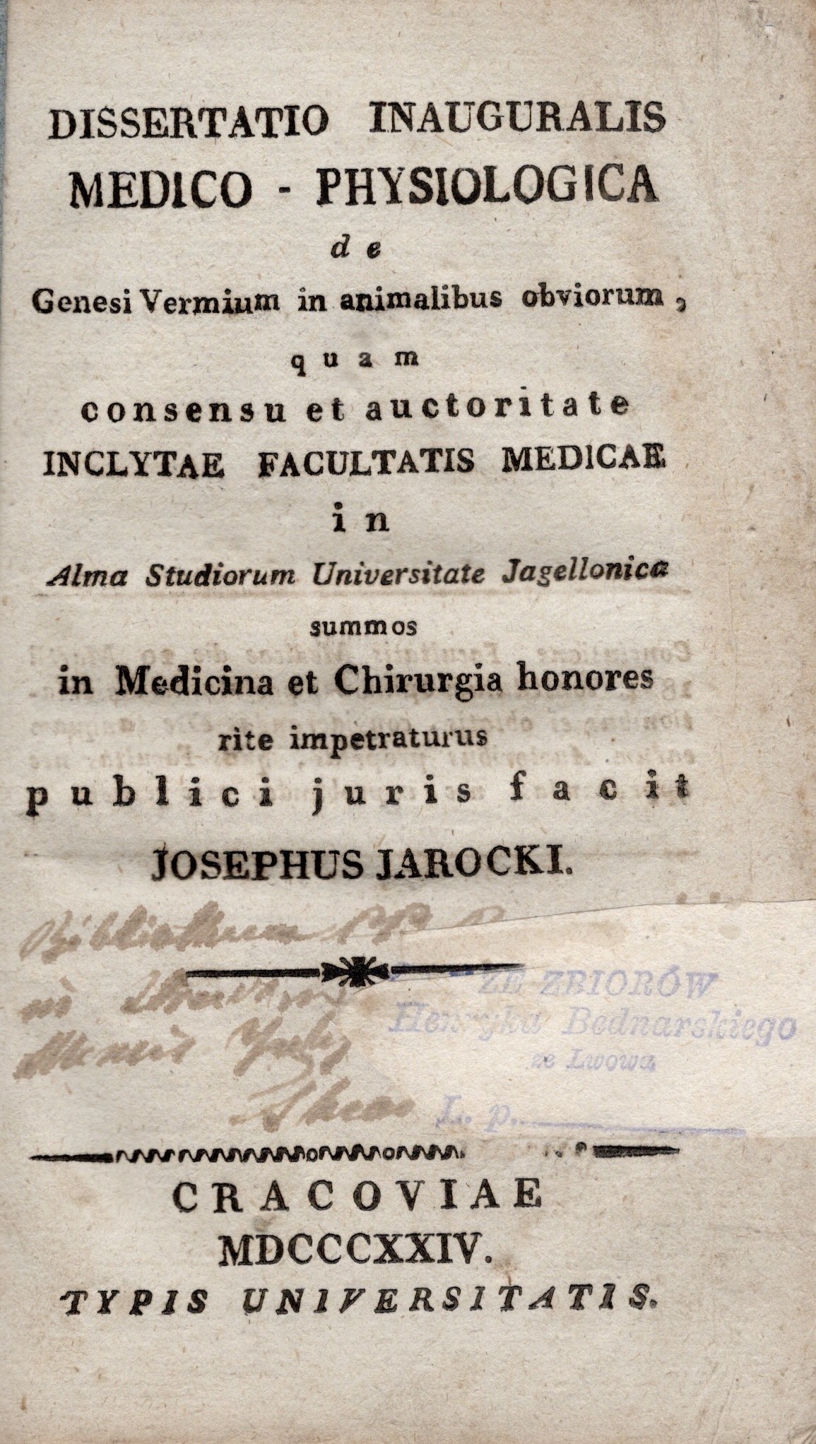 JAROCKI Józef - Dissertatio inauguralis medico-physiologica de Genesi Vermium in animalibus obviorum, quam [...] publici juris / facit [...] Cracoviae 1824 / Z biblioteki Henryka Bednarskiego