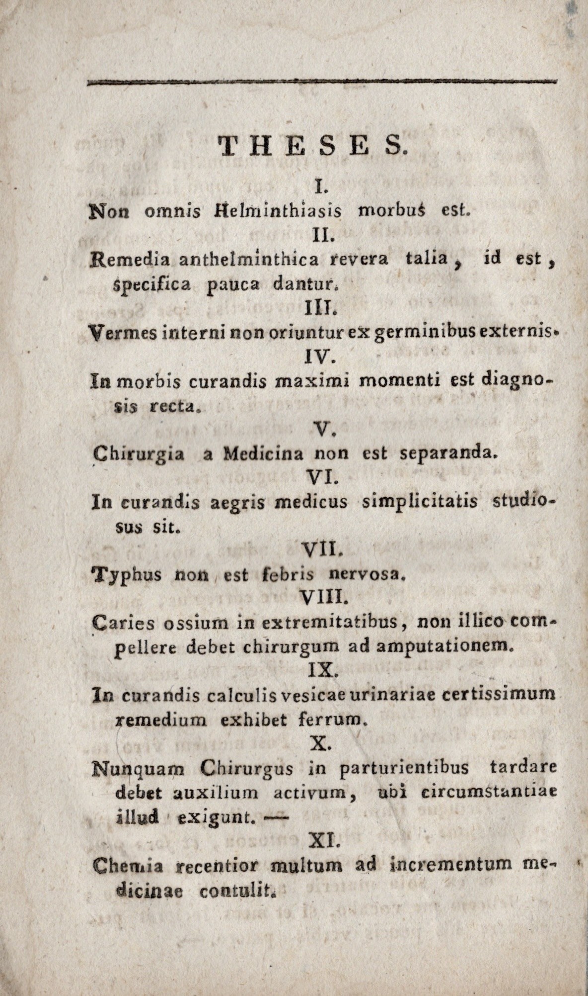 I. Nie każda robaczyca jest chorobą. II.Środki przeciwrobacze są faktycznie podawane jako takie, to znaczy kilka konkretnych. III. Robaki wewnętrzne nie powstają z zarazków zewnętrznych. IV. Prawidłowa diagnoza ma ogromne znaczenie w leczeniu chorób. V. Chirurgia i medycyna nie są od siebie oddzielone. VI. W leczeniu chorych lekarz powinien dążyć do prostoty. VII. Tyfus nie jest gorączką nerwową. VIII. Próchnica kości kończyn, nie od razu com. musi zawieźć chirurga do amputacji. IX. W leczeniu kamicy pęcherza moczowego żelazo jest niezawodnym lekarstwem. X. Chirurg nigdy nie powinien zwlekać z udzieleniem aktywnej pomocy kobiecie rodzącej, jeśli wymagają tego okoliczności. XI. Nowoczesna chemia w ogromnym stopniu przyczyniła się do rozwoju medycyny