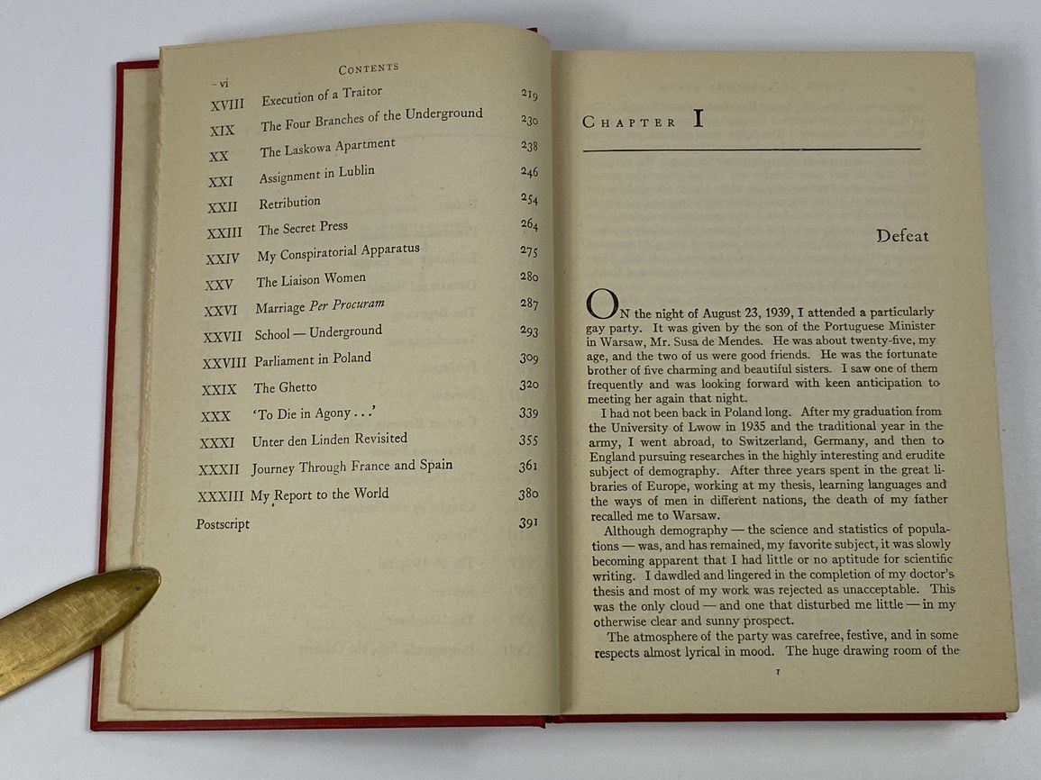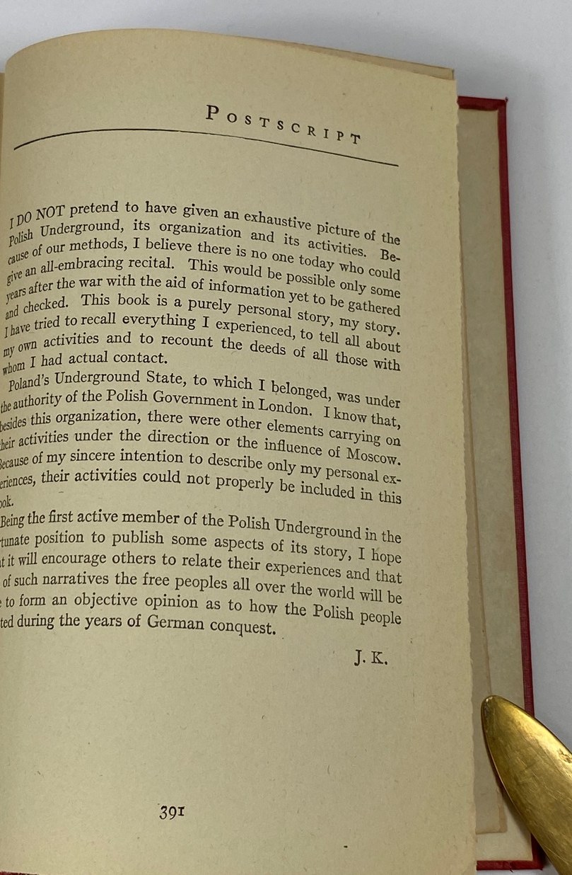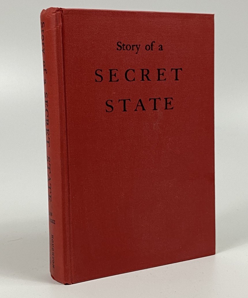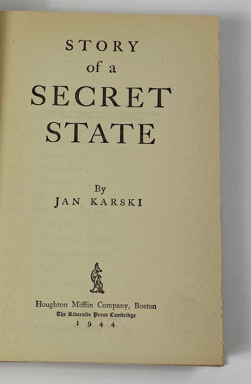 Karski Jan, Story of a secret state, Houghton Mifflin Company, Boston 1944, wydanie I, s. 389, wymiary 13,5 x 20 cm. Ex libirs na wyklejce. Okładka płócienna, wydawnicza.