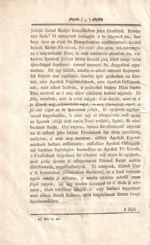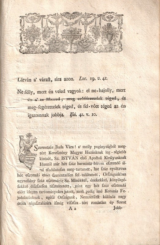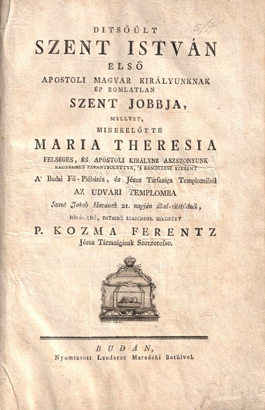 Kozma Ferenc Xavér: Ditsőűlt Szent István első apostoli magyar királyunknak ép romlatlan Szent Jobbja, mellyet, minekelőtte Maria Theresia felséges, és apostoli királyné aszszonyunk kegyelmes parantsolattya, 's rendelése szerént A' Budai Fő-Plébánia, és Jésus Társasága Templomából az udvari templomba Szent Jakab Havának 21. napján által-vitetődnék, hálá-adó, ditsérő beszéddel hirdetett Kozma Ferentz. Budán, [1771]. Nyomatott Landerer maradéki betűivel. [26] p. Egyetlen kiadás. A címlapon a címfelirat alatt a Szent Jobbot ábrázoló rézmetszetű vignetta. Kozma Ferenc Xavér (1728-1806) jezsuita szerzetes beszéde a külföldről Budára érkező nemzeti ereklye hazatérése alkalmából hangzott el. Szent István mumifikálódott jobbját a XI. századtól az erre a célra alapított szentjobbi apátságban őrizték; a török időkben Fehérvárra menekítették, majd Boszniába került. Később a raguzai domonkos kolostorban lappangott. Arra utazó magyar főurak híradásai nyomán Mária Terézia vásárolta vissza a katolikus ereklyét, melyet rövid, schönbrunni kitérő után 1771 júniusában, ünnepélyes keretek között hoztak Budára. Oldalszámozáson belül néhány szövegközti fametszettel illusztrált. XIX. század második felében készült, aranyozott félmaroquin kötésben. Dekoratív, szép példány.