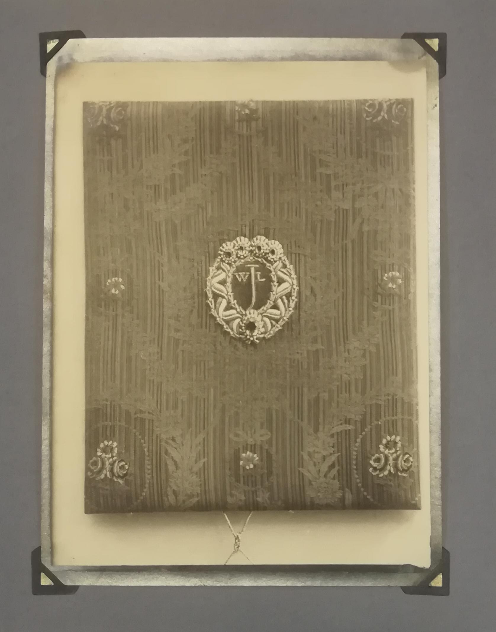 Zasłużony dla ratowania polskich zbiorów i ich konserwacji. Fotografia: Teka na dyplom, oprawa w atłas o wzorze pasemkowym, dekorowanym textrą. Monogram, otoka oraz motywy kwiatowe rozmieszczone w rogach i po bokach oprawy ręcznie haftowane. Oprawa wykonana w r. 1915 w warsztacie szkoły introligatorskiej przy Muzeum Przemysłowym w Krakowie.