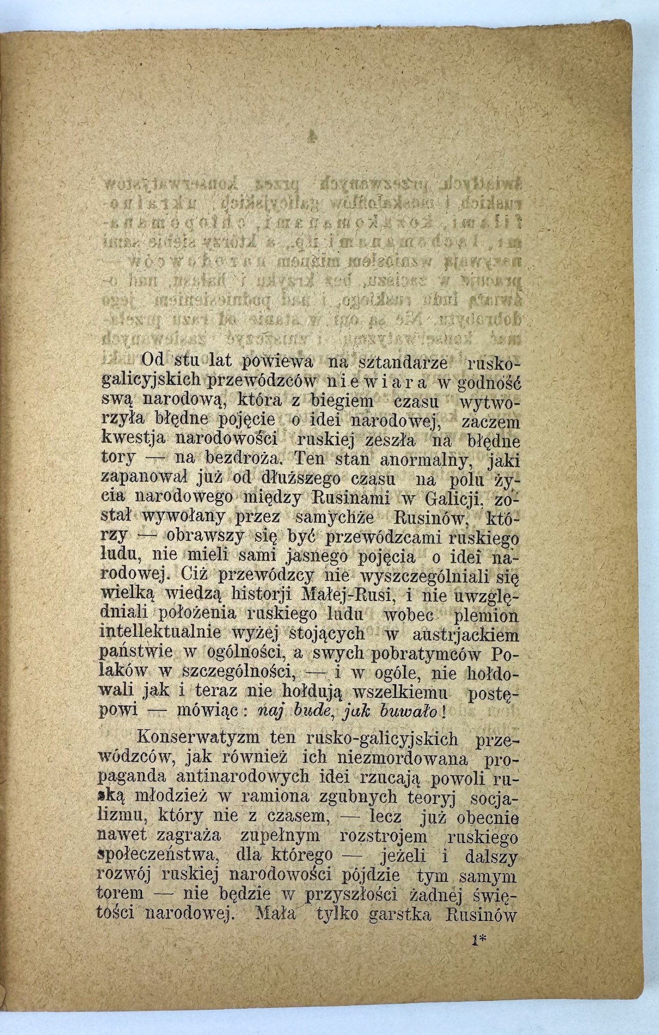 Od stu lat powiewa na sztandarze rusko-galicyjskich przewódzców niewiara w godność swą narodową, która z biegiem czasu wytworzyła błędne pojęcie o idei narodowej, zaczem kwestja narodowości ruskiej zeszła na błędne tory - na bezdroża.