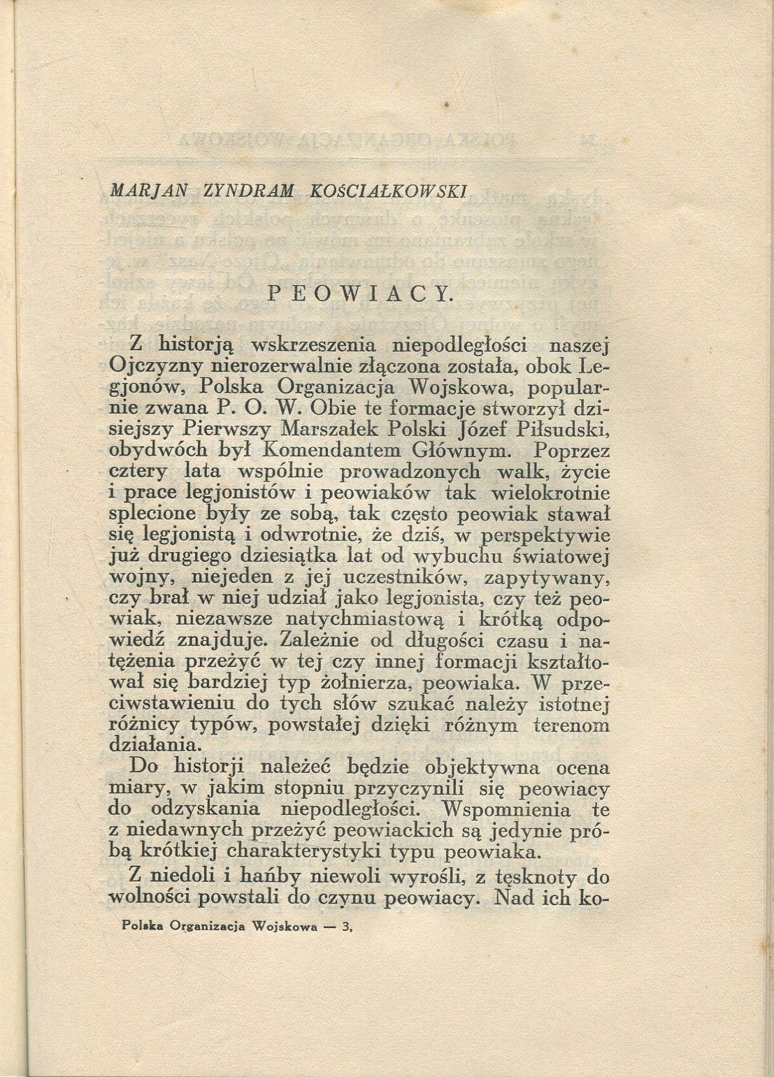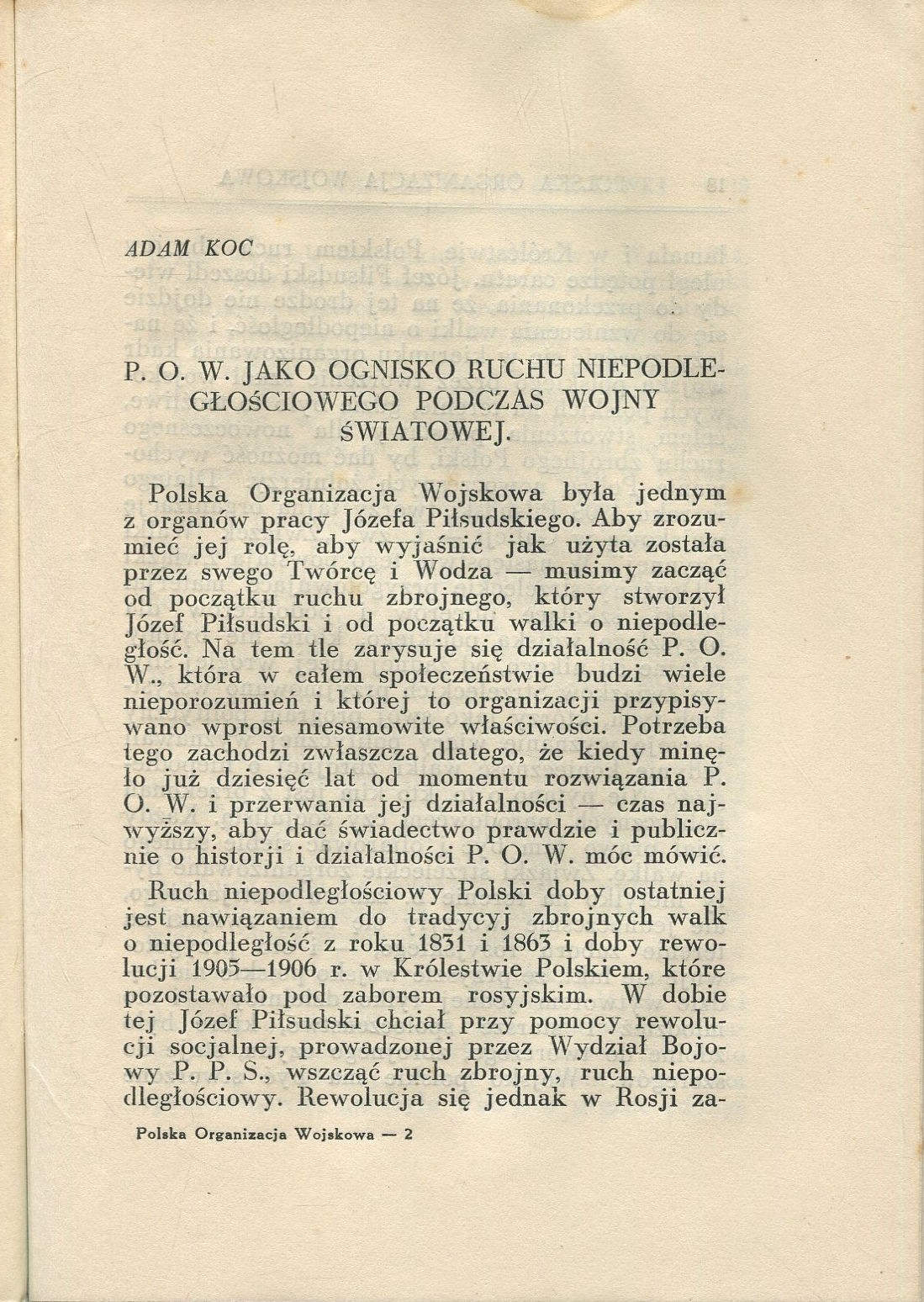 Zbiór wspomnień, relacji i szkiców autorstwa byłych członków POW, którzy opisują swoje doświadczenia z okresu działalności konspiracyjnej oraz walki o niepodległość Polski. Wśród autorów m.in. Adam Koc, Marian Zyndram-Kościałkowski, Aleksander Budrys-Budrewicz, Adam Rudnicki, Wacław Sieroszewski, Tadeusz Różycki, Adam Borkiewicz, Michał Sokolnicki.