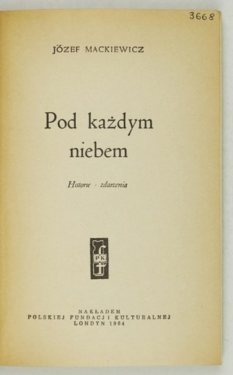 MACKIEWICZ Józef - Pod każdym niebem. Historie, zdarzenia. Londyn 1964. Polska Fundacja Kulturalna. 16d, s. 158, [2]. brosz.