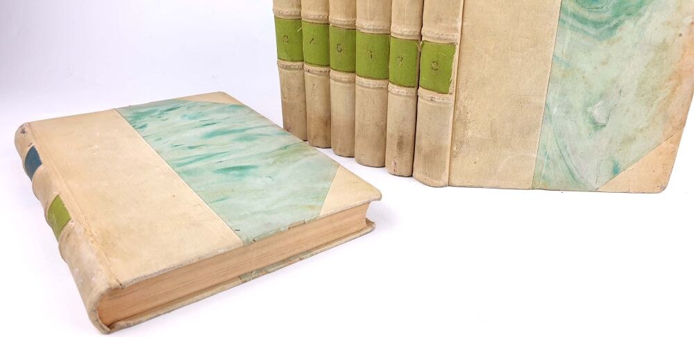 TWARDA OPRAW PÓŁPŁÓCIENNA Z EPOKI IMITUJĄCA PERGAMIN. GRZBIETY Z WYPUKŁYMI ZWIĘZAMI,TŁOCZENIAMI I ZŁOCENIAMI ORAZ DWOMA BARWNYMI SZYLDAMI. KARTON MARMORYZOWANY, OZDOBNE WYKLEKJKI