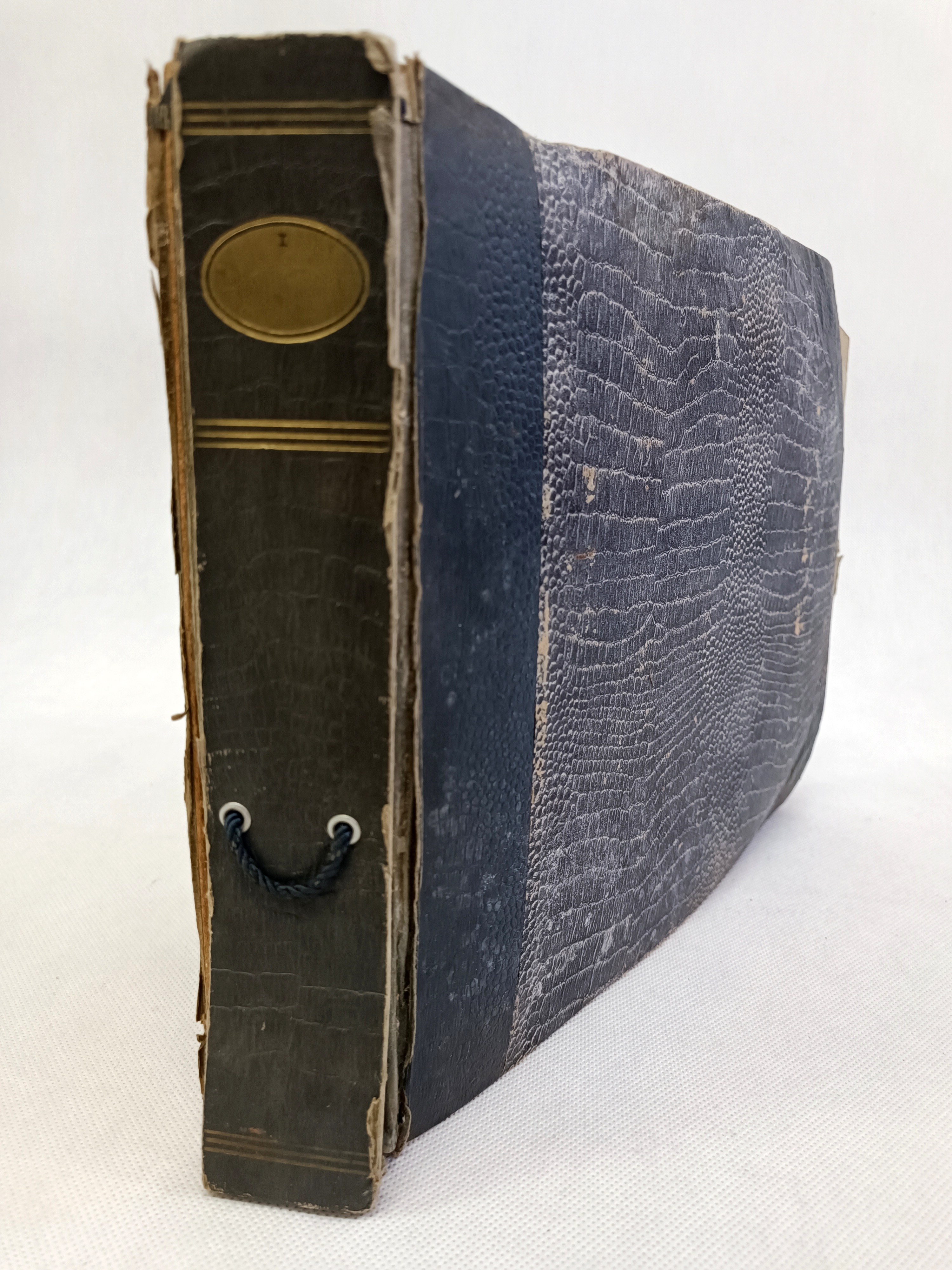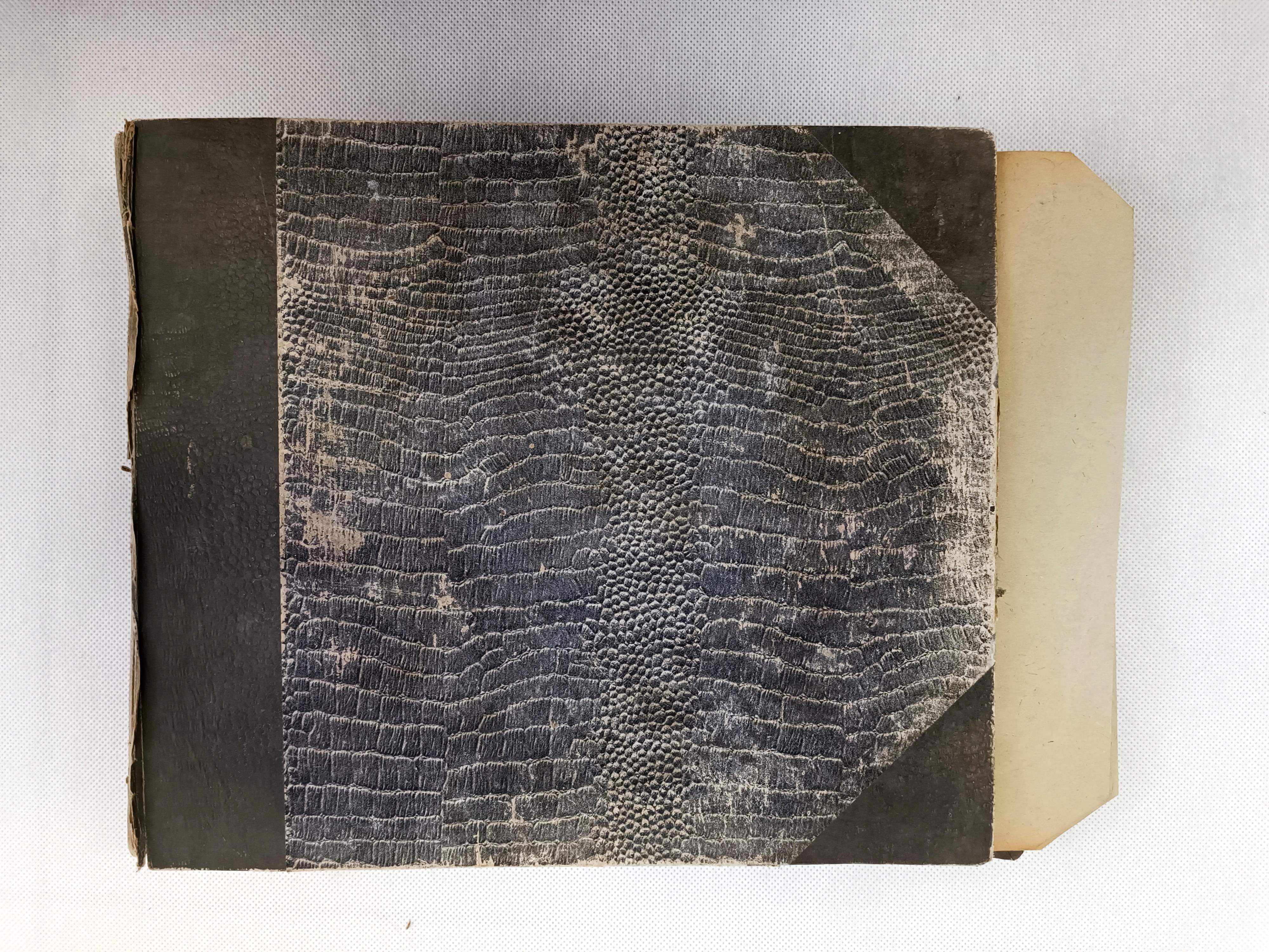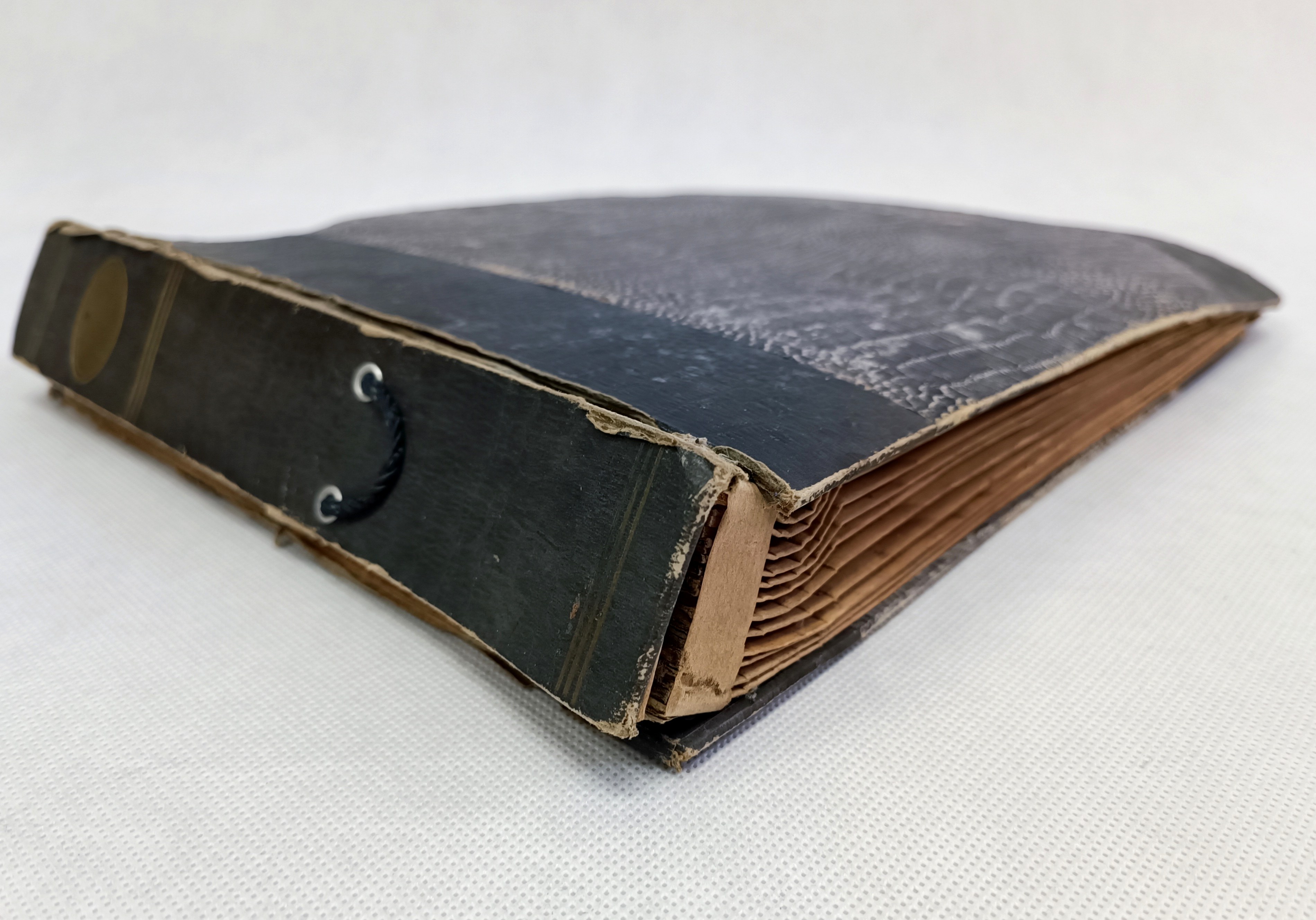 Wykonany z twardej, grubej tektury obciągniętej papierem zdobiony wzorem imitującym skórę.