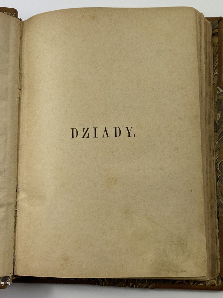 Mickiewicz Adam, Dziady, Poezje Adama Mickiewicza. [T. 4], Księgarnia Polska, Lwów 1886, s. 311, wymiary 11,5 x 16 cm. Nieakt. pieczęć własności. Półskórek wykonany w pracowni Suszek Books.