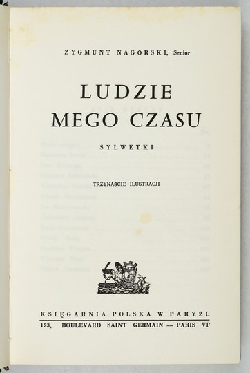 NAGÓRSKI Zygmunt [Julian] senior - Ludzie mego czasu. Sylwetki. Trzynaście ilustracji. Paryż 1964. Księg. Polska. 8, s. 269, tabl. 13. opr. późn. pł. z zach. obu okł. brosz.