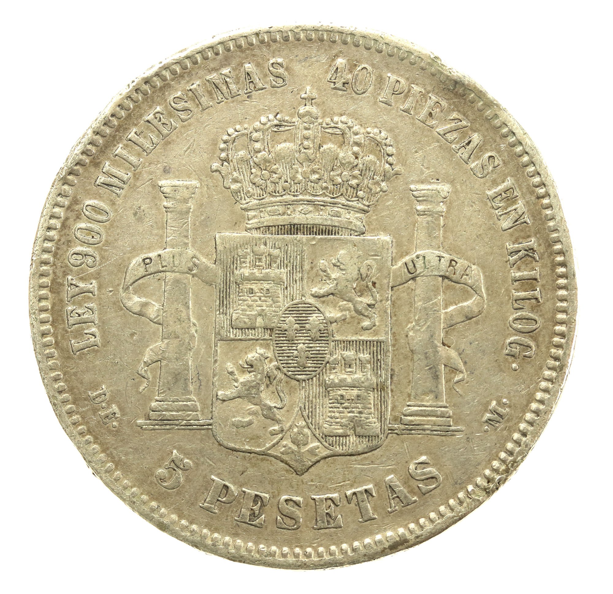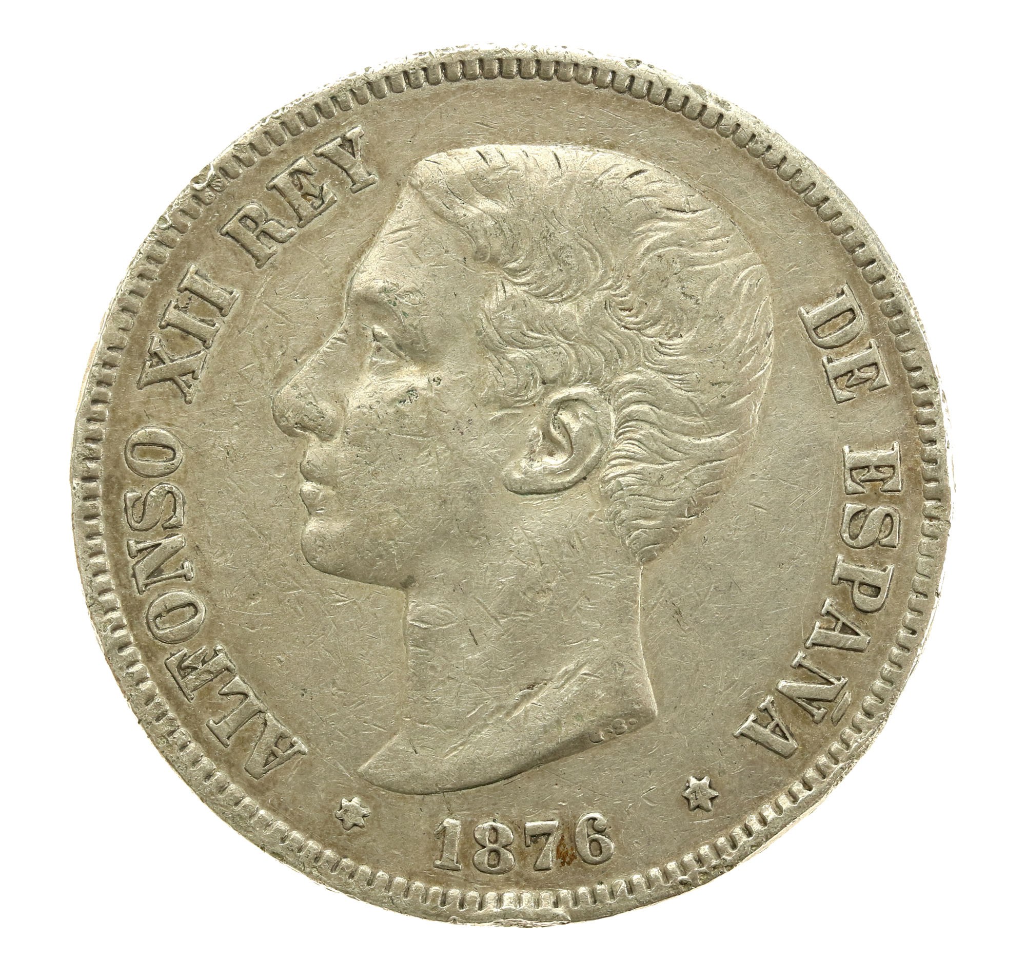 Hiszpania, Alfons XII, 5 peset, 1876 DE-M, Madryt. Srebro 900, waga katalog. 25,00 grama. Stan 3+.