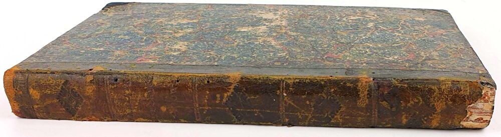 TWARDA OPRAWA PÓŁSKÓREK Z EPOKI, GRZBIET PŁASKI ZE ZŁOCENIAMI, KARTON MARMORYZOWANY