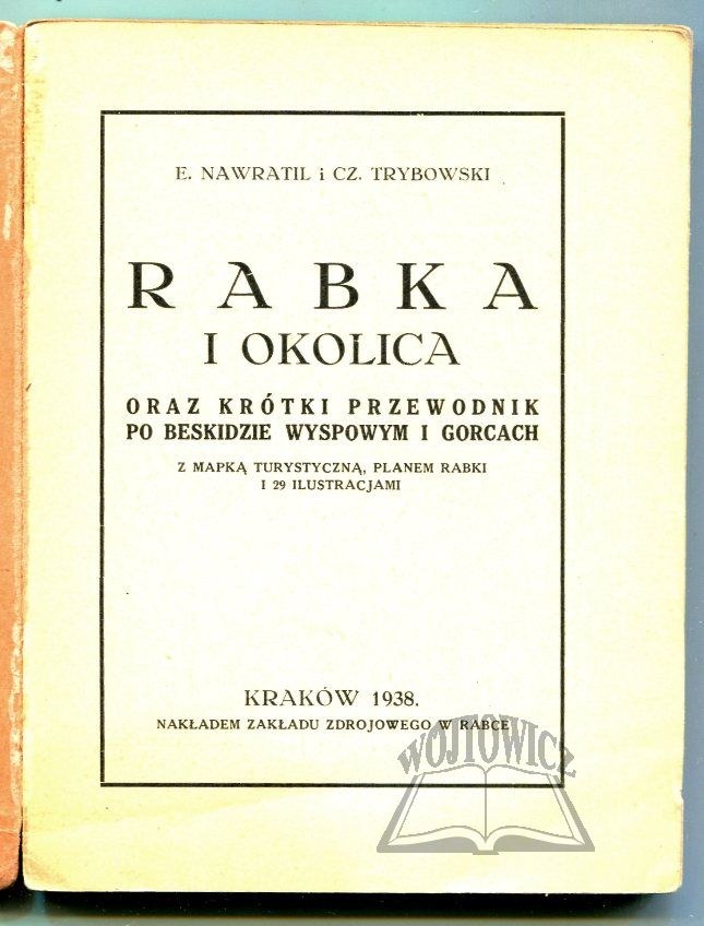 Z mapka turystyczną, planem Rabki i 29 ilustracjami. Kraków 1938. Nakł. Zakł. Zdrojowego w Rabce. 8 (mała), s. [6], 123, [3], ilustr. oraz mapy w tekście, rozkł. plan i mapa, okł. brosz. oryg. Przybrudz. i otarcia okł., niew. przetarcie z tyłu okł., niew. ubytek okł. dolnej krawędzi grzbietu, plan rabki z podkreśleniami.