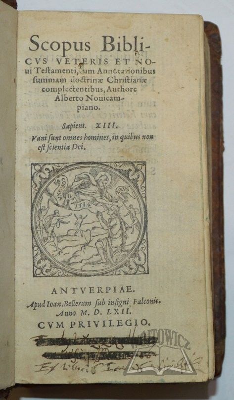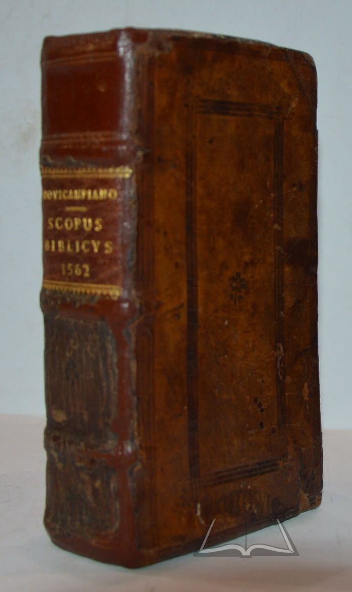 (Estr. T. 23). Ślady niew. zawilg. i kornika, wczesny wpis własn. na wyklejce i karcie tyt., oprawa naprawiana (grzbiet). Scopus biblicus (wyd.1: 1553) zawiera podsumowanie nauki chrześcijańskiej. "... to pismo i dzisiaj znajdować się (powinno) w ręku duchownych osób, sposobiących się do tego stanu. ... Nepodobną możeby się rzeczą zdawało komu innemu, tak wiele ... powiedzieć o dogmatach, tajemnicach i prawdach katolickiej religii..." (Chodynicki I.- Dykcyonarz uczonych Polaków). Wojciech Nowopolski (1505-1558), doktor medycyny, filolog i teolog. Prof. Akademii Krakowskiej. Na początku zajmował się medycyną (jest autorem pierwszego podręcznika anatomii w Polsce), a następnie był wykładowcą greki. Pod koniec swojej pracy naukowej poświęcił się teologii. Rzadkie.