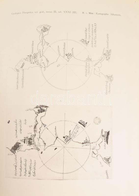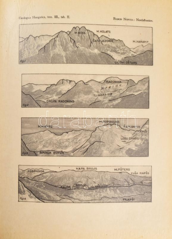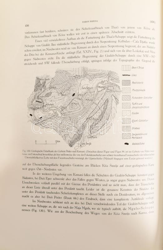 Nopcsa, [Ferenc] Franz: Geographie und Geologie Nordalbaniens mit einem Anhange von H. v. Mzik: Beiträge zur Kartographie Albaniens nach orientalischen Quellen. 1-706 paginae. I-XXXV tabulae, 189 figurae texti insertae. Geologica Hungarica III. Bp., 1939., Institutum Regni Hungariae Geologicum [Magyar Kir. Földtani Intézet], (Stádium-ny.), XIV+2+620 p. +1 t. +XXVIII (közte egy nagyméretű, színes kihajtható térképpel) t.+3+[625]-703+1 p.+XXIX-XXXIV (6 t.) Német nyelven. Gazdag fekete-fehér képanyaggal illusztrált. Átkötött modern egészműbőr-kötés, az első táblán gyűrődésekkel, régi intézményi bélyegzésekkel, jó állapotban.
