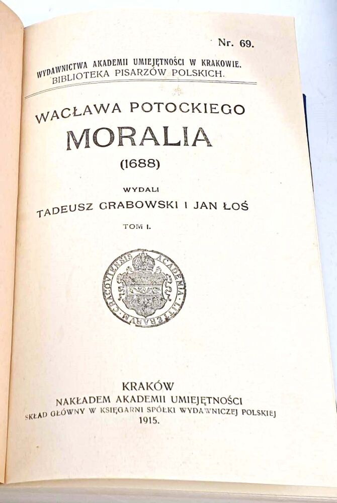 Moralia - "zbiór wierszy W. Potockiego, liczący ponad 2100 utworów, powstały w latach 1688-1694. Inspiracją dla autora były 'Adagia' Erazma z Rotterdamu, zbiór łacińskich przysłów komentowanych przez Erazma, po raz pierwszy wydany w 1500 roku [...]. W 'Moraliach' [...] pojawiają się m.in. wyrazy szacunku dla tradycji antyku, ale przede wszystkim krytyka Kościoła oraz polskiego społeczeństwa doby baroku. Potocki ukazuje apokaliptyczny obraz współczesności, a także ponure wizje przyszłości. Opowiada się za wzmocnieniem władzy króla, co równałoby się osłabieniu władzy szlachty. 'Moralia' cechuje pesymizm i ostrość sądów. 'Moralia' nie były przeznaczone do druku. Zostały wydane dopiero w latach 1915-1918, w trzech tomach [...]. Potocki nie udostępnił swojego dzieła czytelnikom, gdyż nie wierzył w możliwość przekonania ich do swoich racji" (Wikipedia).
