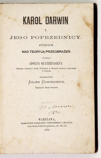 [QUATREFAGES de Bréau Jean Louis Armand de] - Karol Darwin i jego poprzednicy. Studyjum nad teoryją przeobrażeń. Dzieło Adolfa Quatrefages'a. Przeł. Juljan Ochorowicz. Warszawa 1873. Gebethner i Wolff. 16d, s. XXV, [1], 325, [2]. opr. psk. z epoki.