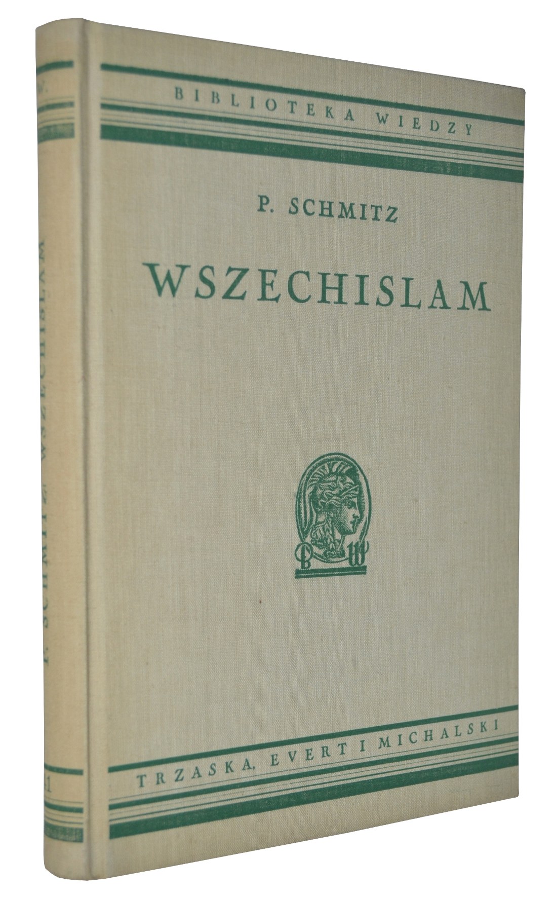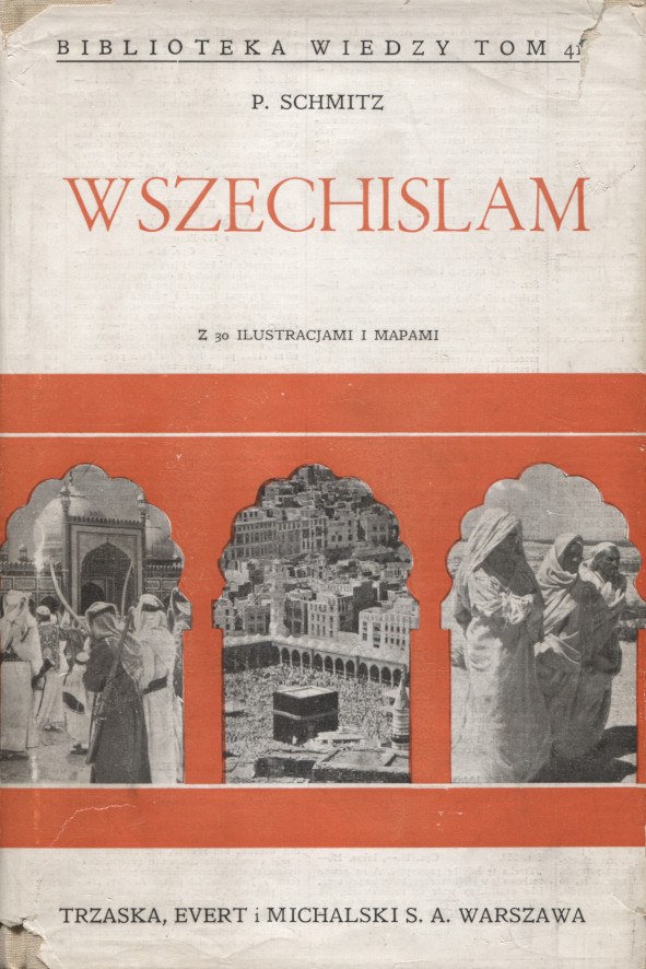 SCHMITZ, Paul - Wszechislam: z 30 ilustracjami i mapami / P. Schmitz; przełożył Stanisław Kozicki. Warszawa [1939], Trzaska, Evert i Michalski. 22 cm, s. [6], 224, s. tabl. [16] z ilustr., k. tabl. [1] z mapą, mapy w paginacji; opr. wyd.: pł., obw. Biblioteka Wiedzy; t. 41.