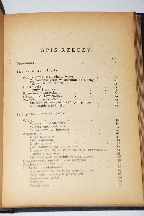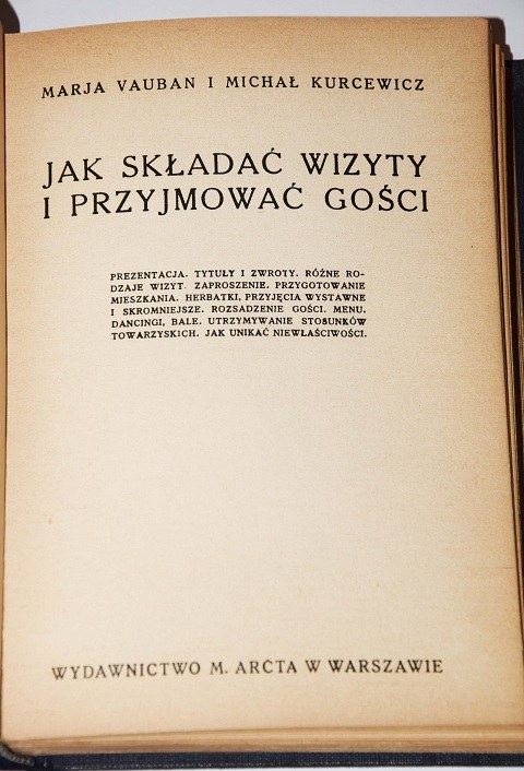 VAUBAN MARJA; KURCEWICZ MICHAŁ – JAK SKŁADAĆ WIZYTY I PRZYJMOWAĆ GOŚCI. Prezentacja. Tytuły i zwroty. Zaproszenie. Przygotowanie mieszkania. Herbatki, przyjęcia wystawne i skromniejsze, rozsadzanie gości, menu. Dancingi, bale. Utrzymywanie stosunków twoarzyskich. Jak unikać niewłaściwości. WYDAWNICTWO M.ARCTA, WARSZAWA 1935r., str. 151, [3]; oraz: