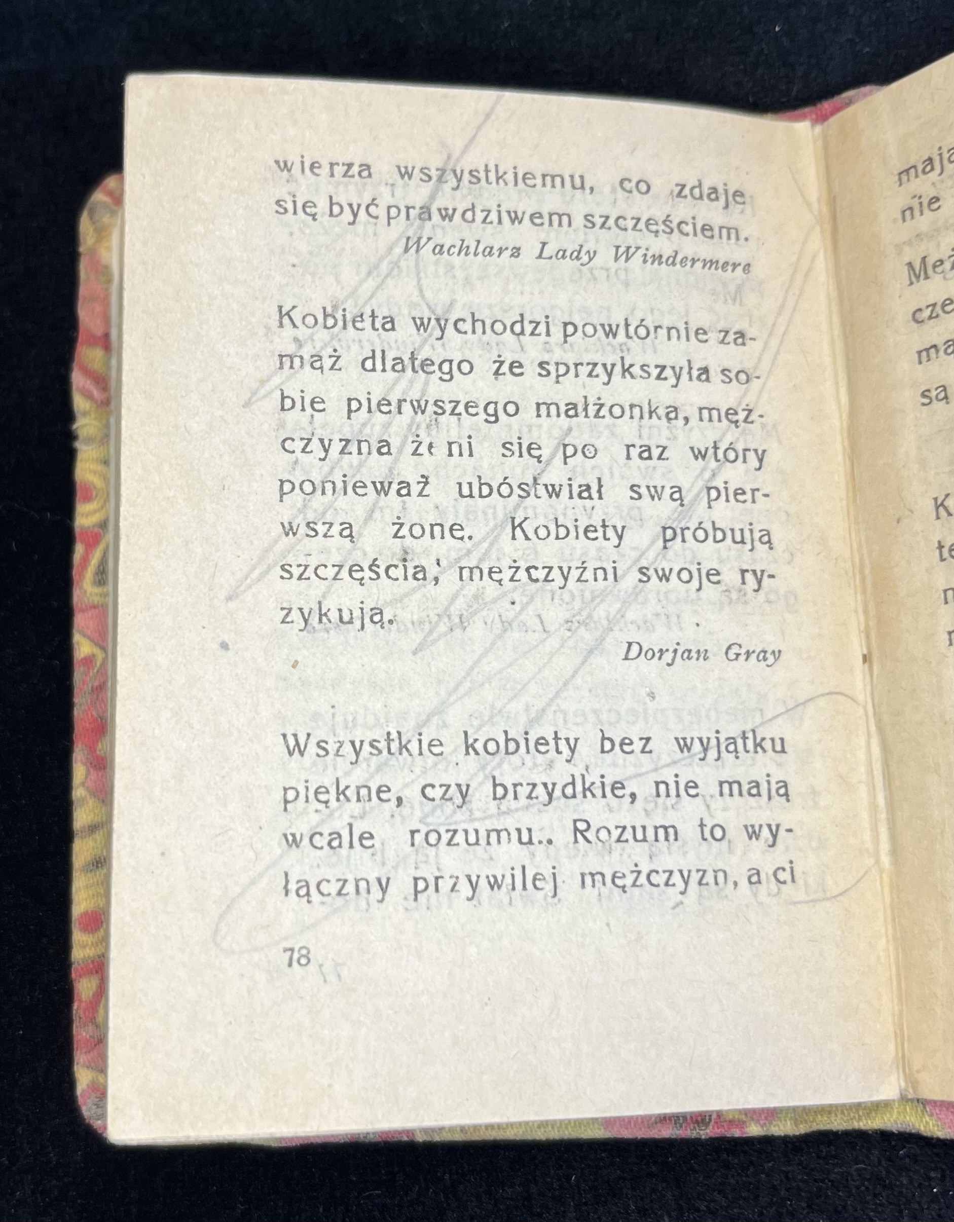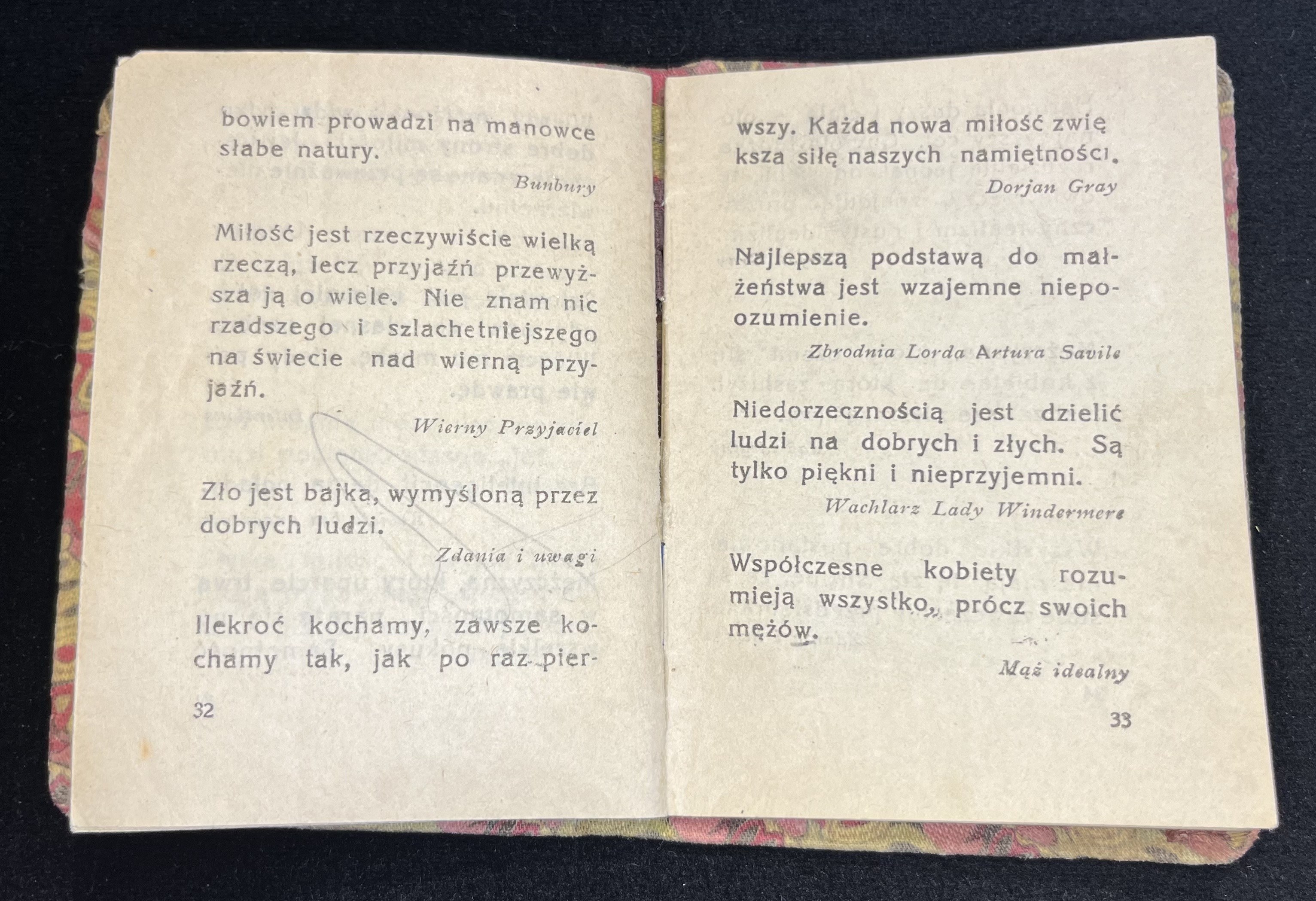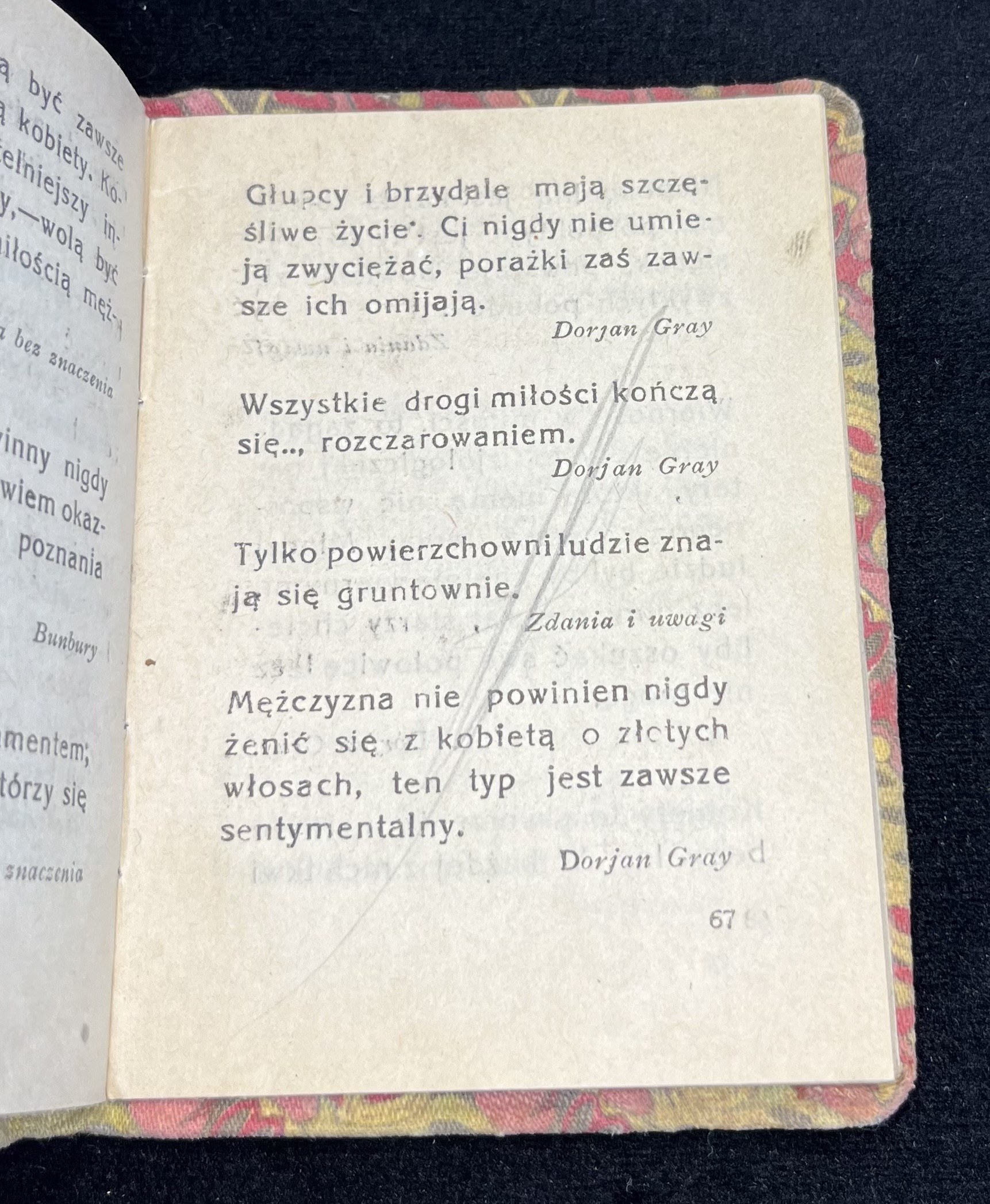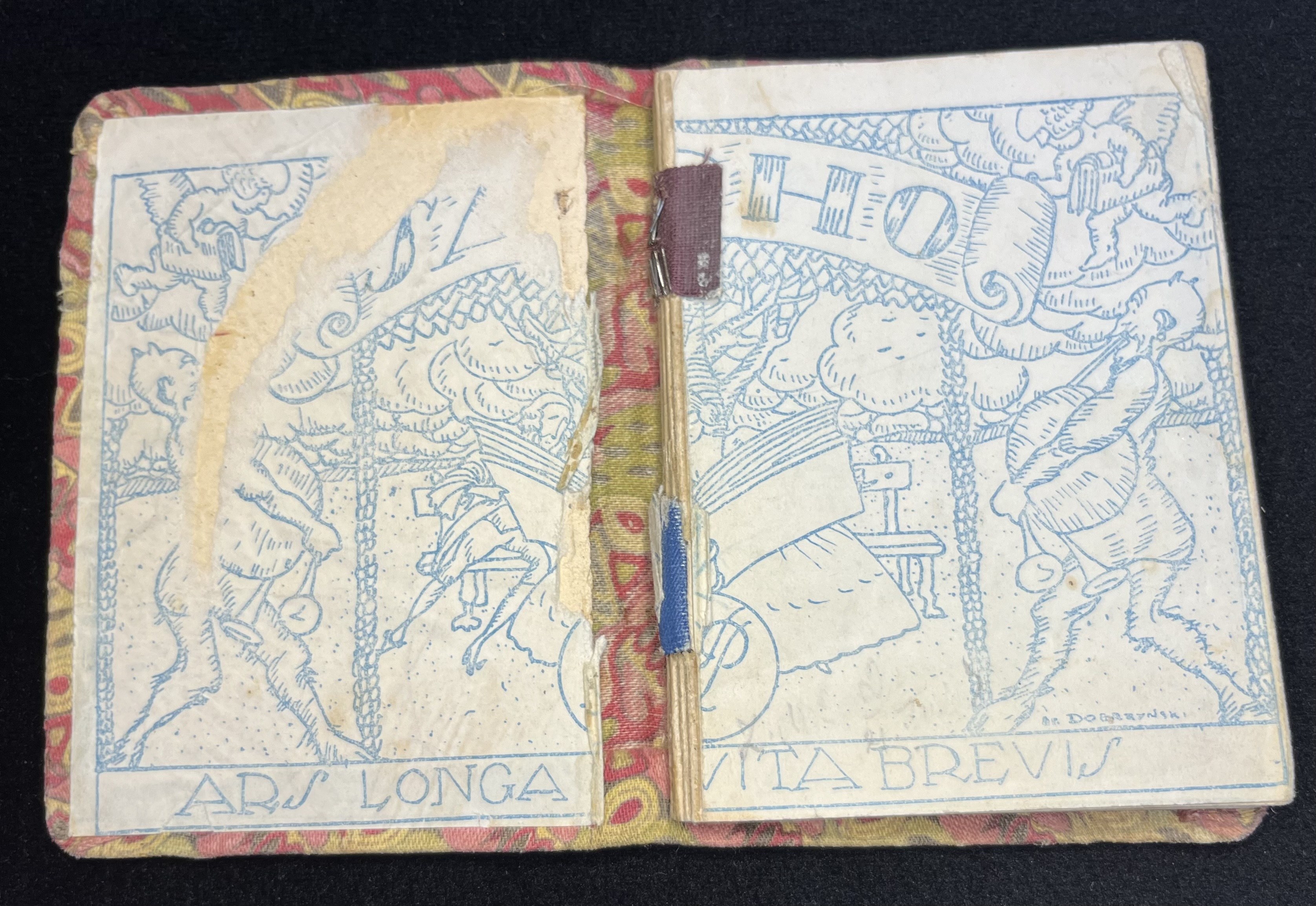 Stan: oprawa wydawnicza - ozdobna kolorowa satyna, ozdobne wyklejki projektu St. Dobrzyńskiego z łacińską sentencją „Ars longa vita brevis”, przednia okładka oderwana od bloku, kilka kart pomazanych ołówkiem, przednia wyklejka uszkodzona, tylna pomazana ołówkiem