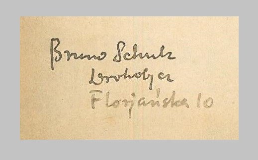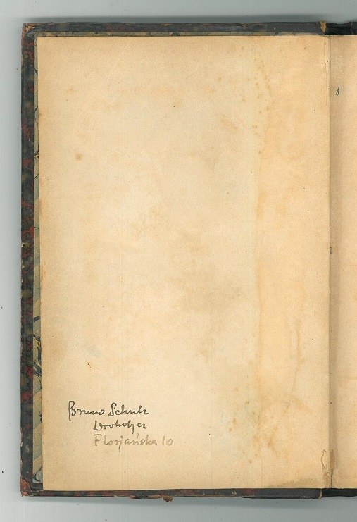 Na wyklejce odręczny podpis "Bruno Schulz Drohobycz Florjańska 10". Niew. otarcia oprawy, zażółcenia kart. Stan dobry. Bruno Schulz (1892 - Drohobycz - 1942) - polski prozaik żydowskiego pochodzenia, grafik, malarz, rysownik i krytyk literacki. Wielka rzadkość.