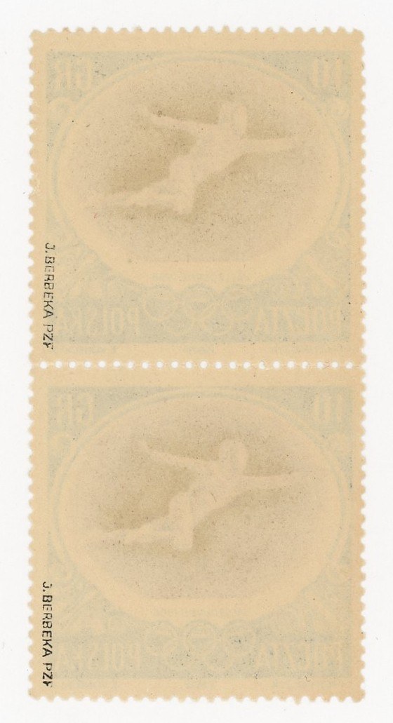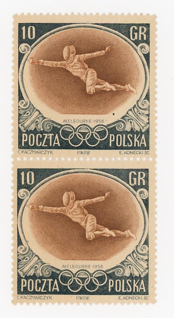 XVI Igrzyska Olimpijskie w Melbourne 1956, pionowa parka. Górny znaczek: błąd, plamka między "Z" i "T". Gwarancja Berbeka. Niekasowane, bez podlepek. Fi 843