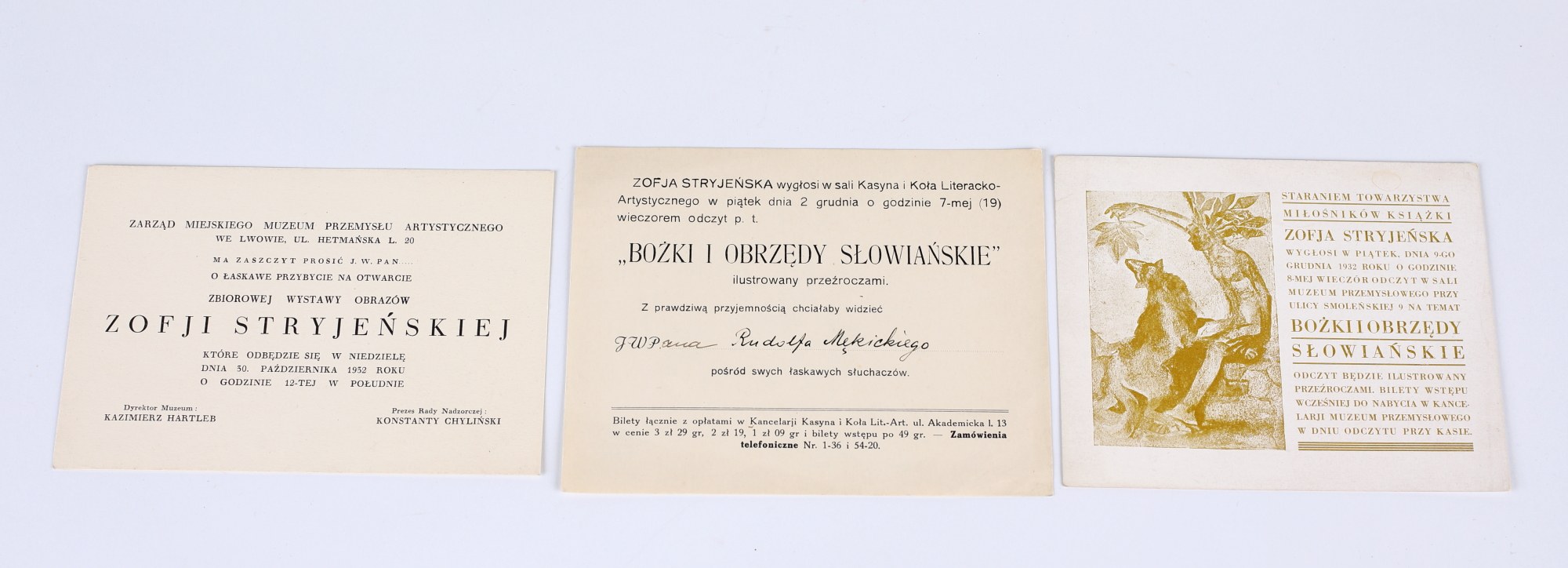 1. Zaproszenie na odczyt Z. Stryjeńskiej "Bożki i obrzędy słowiańskie", wypisane dla Rudolfa Mękickiego ("Zofia Stryjeńska wygłosi w sali Kasyna i Koła Literacko-Artystycznego w piątek dnia 2 grudnia o godzinie 7-mej (19) wieczorem odczyt p. t. [...]"). Lwów 1932.