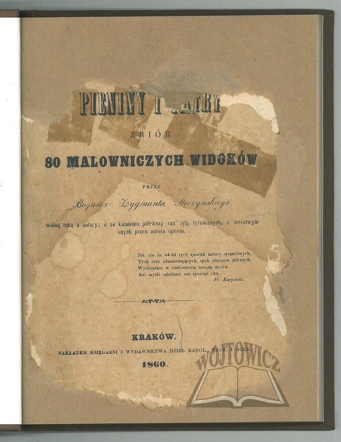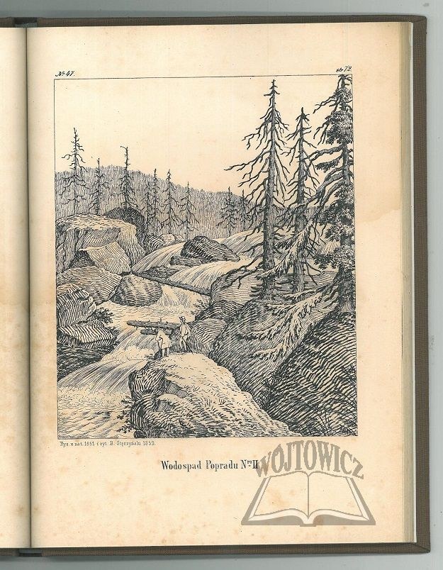Ślady mocnych zawilg. i zaplam., karta tyt. zachowana we fragmencie (naprawiana), brak 3-ech tablic (nr 3, 4, 12). Jedna z dwóch głównych prac tatrzańskich w dorobku autora. Album składa się z części tekstowej zawierającej objaśnienia i z 80 litografii (brak 3-ech) wg. rysunków z natury Stęczyńskiego, przedstawiajacych widoki, miasta, ruiny, zabytki i krajobrazy Pienin i Tatr. Stęczyński Bogusz Zygmunt (1814 - 1890), pisarz, poeta, malarz, rysownik, litograf, leśniczy, bibliotekarz, krajoznawca. Około poł. XIX w. Stęczyński był niewątpliwie jednym z najbardziej aktywnych krajoznawców pol. i turystów tatrz., jednym z najlepszych wówczas znawców Pienin, Tatr i Podtatrza (również Śląska i Sudetów), a także jednym z ich czołowych propagatorów w społeczeństwie polskim.