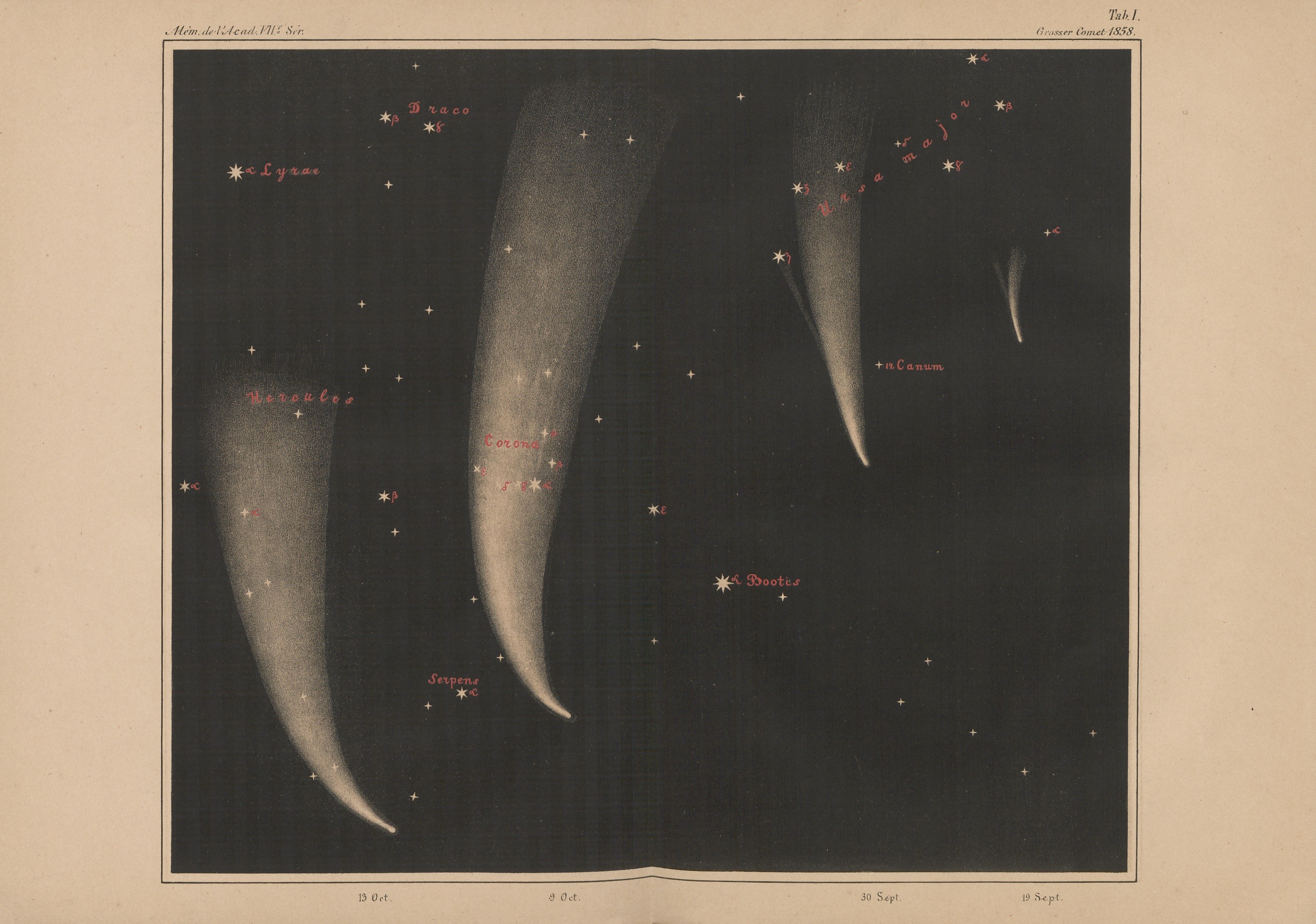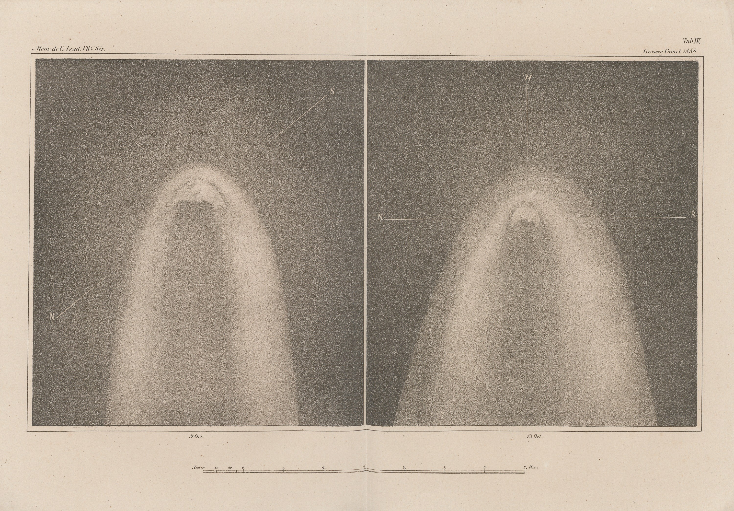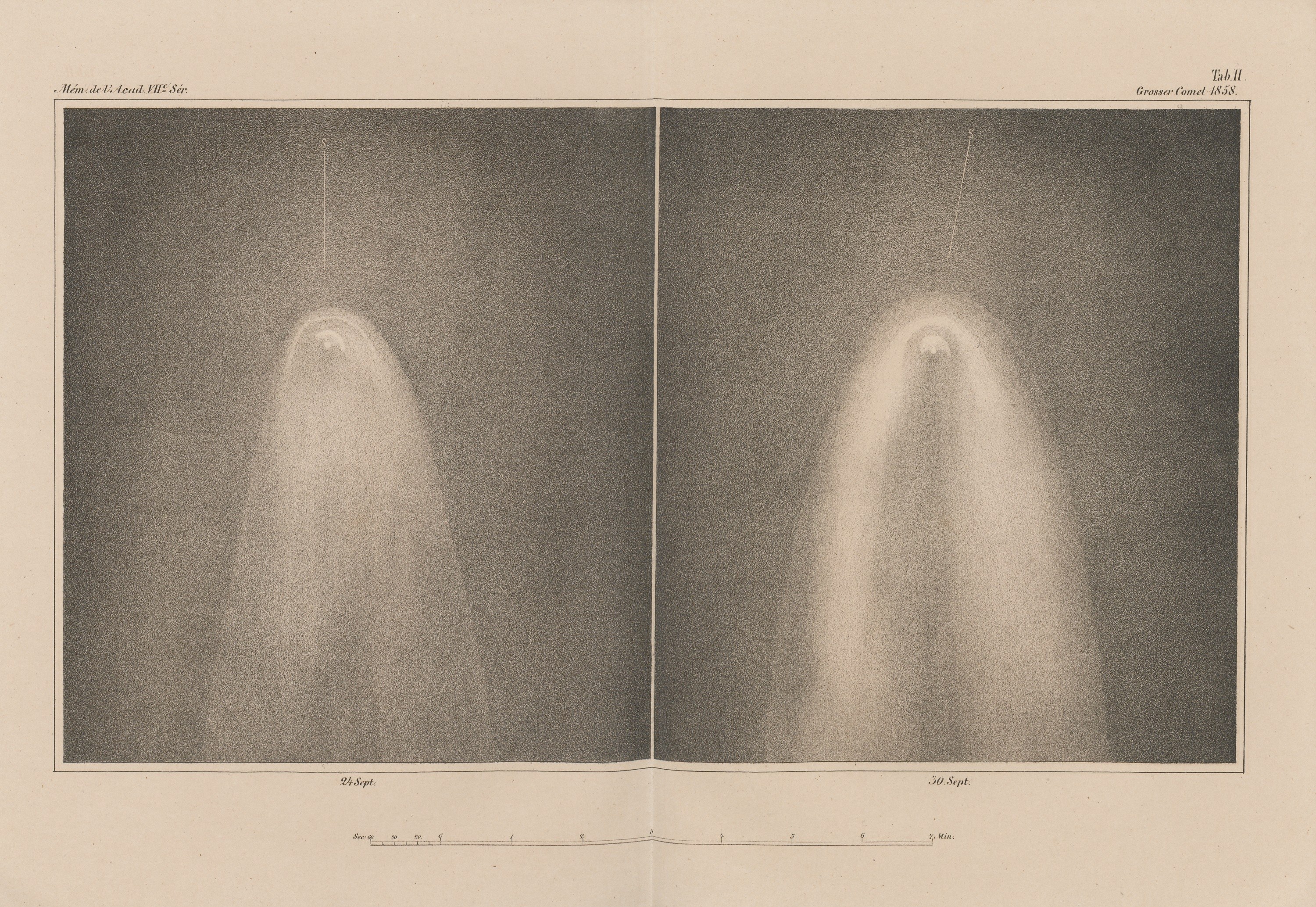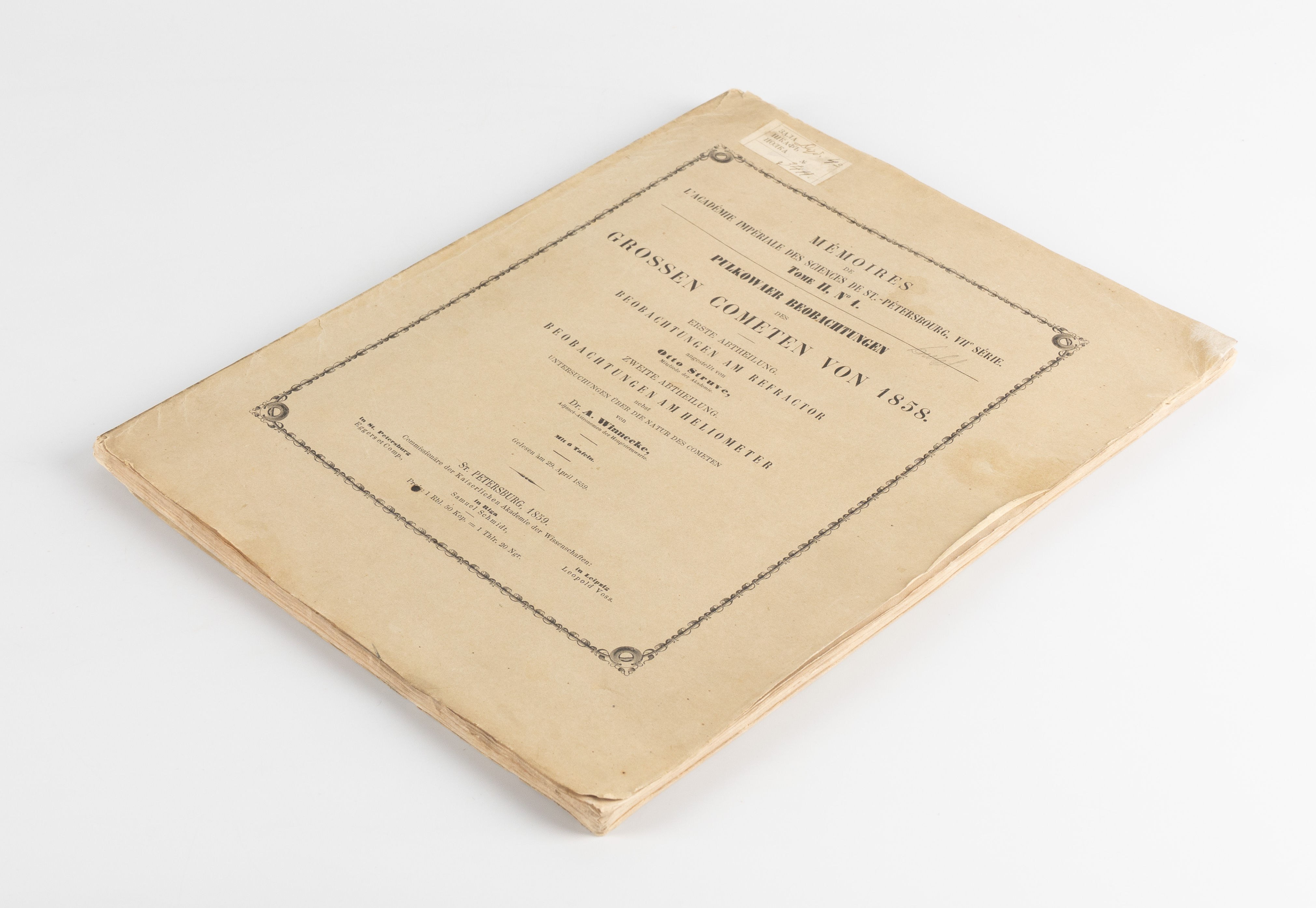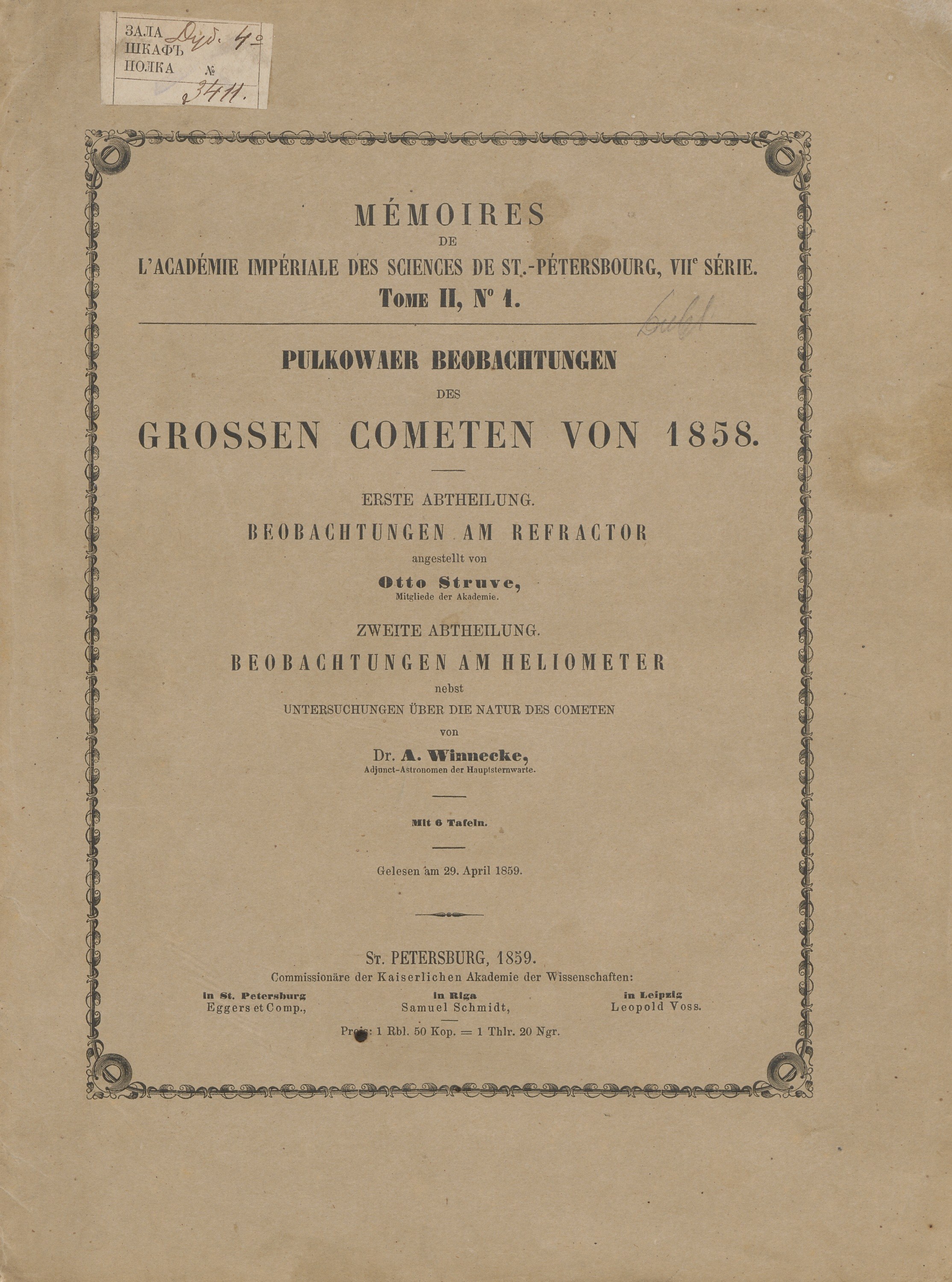 Relacja z obserwacji Wielkiej Komety z 1858 roku, przeprowadzonych w obserwatorium w Pułkowie (główne obserwatorium astronomiczne Rosyjskiej Akademii Nauk położone w odległości 19 km na południe od Petersburga). Została podzielona na dwie części: pierwsza autorstwa Otto Struve, opisuje obserwacje wykonane za pomocą refraktora, natomiast druga, autorstwa Friedricha Augusta Winnecke, prezentuje obserwacje przy użyciu heliometru oraz badania nad naturą komety. Wielka Kometa z 1858 roku to Kometa Donatiego (C/1858 L1), która była najjaśniejszą kometą XIX wieku, obok Wielkiej Komety z 1811 roku. Została nazwana na cześć włoskiego astronoma Giovanniego Battisty Donatiego, który po raz pierwszy zaobserwował ją 2 czerwca 1858 roku. Treść w j. niemieckim.