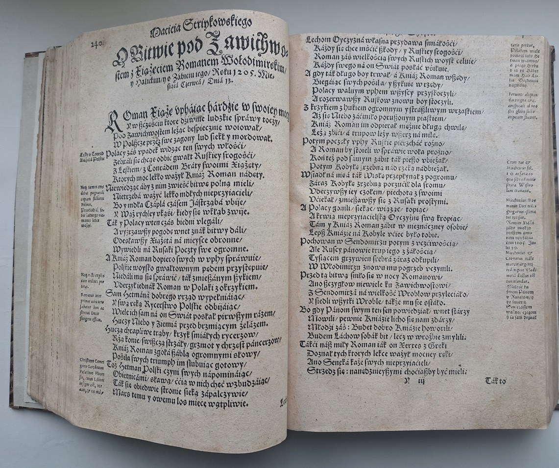 Poz. 1: Estr. XXIX, s. 352-354. Stryjkowski Maciej. Która przedtym nigdy światła nie widziała. Kronika Polska Litewska, Zmodzka, y wszystkiey Rusi Kijowskiey, Moskiewskiey, Siewierskiey, Wołynskiey, Podolskiey, Podgorskiey, Podlaskiey, etc. Y rozmaite przypadki wojenne y domowe, Pruskich, Mazowieckich, Pomorskich, y inszych krain Królestwu Polskiemu y Wielkiemu Xięstwu Litewskiemu przyległych, według istotnego y gruntowego zniesienia pewnych dowodow z rozmaitych Historikow y Autorow postronnych, y domowych, y Kijowskich, Moskiewskich, Sławińskich, Liflantskich, Pruskich, Pruskich starych, Dotąd Ciemnochmurną nocą zakrytych Kronik, y Latopisczow Ruskich, Litewskich, Długosza Oyca dzieiow Polskich… Królewiec 1582. Jerzy Ostenberger.
