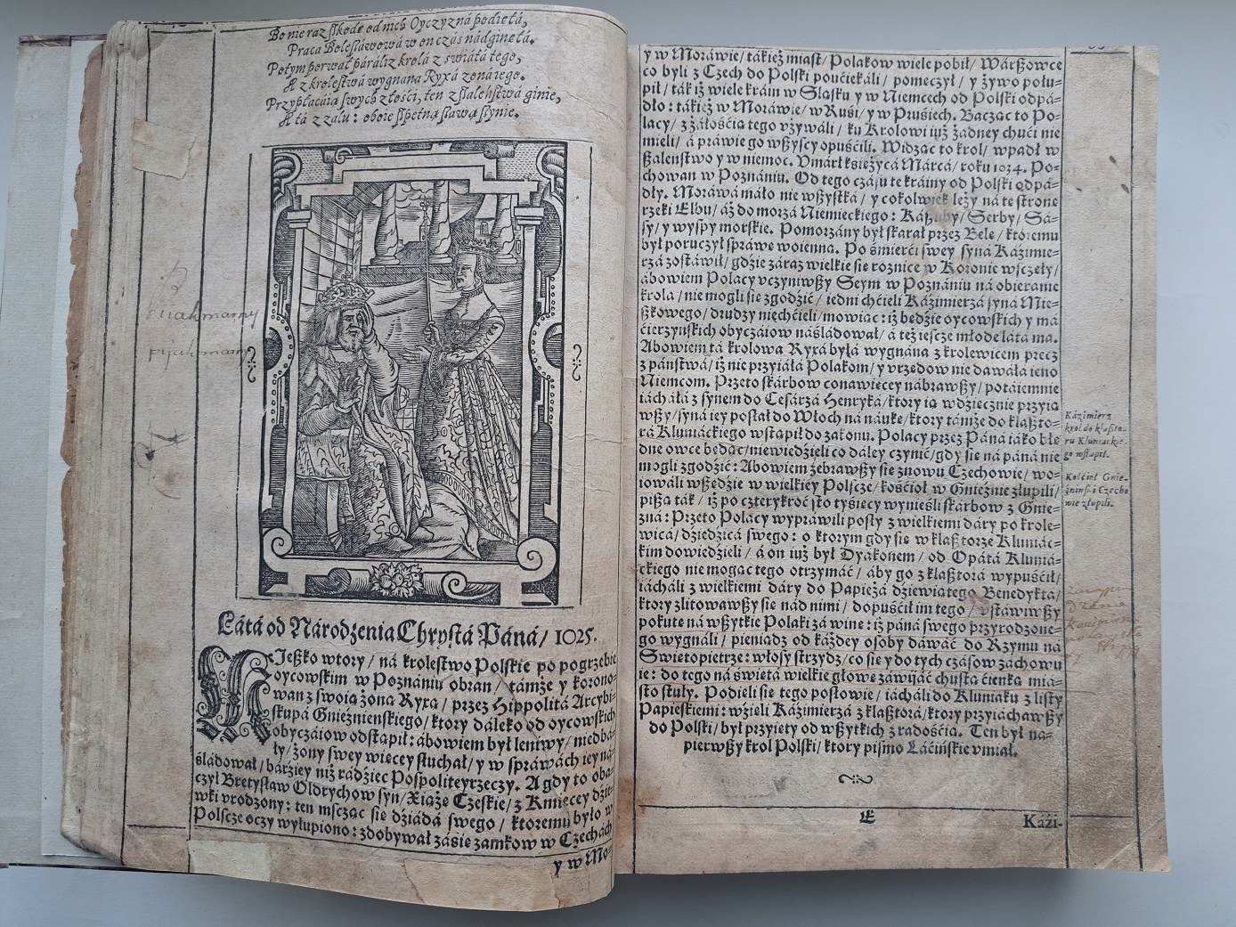 K. 1 notatka piórem " Ta Kronika Styjkowskiego pierwszego królewskiego wydania 1582 roku jest fenix bibliografii polskiej, o rzadkości i ważności tego wydania patrz Bendkowskiego histor. liter. Polskiej Tom 2gi str 719.- jeszcze za czasów Króla Stanisława Augusta roku 1766, kiedy ksiądz Bohomolec przedrukowywał kronikarzy krajowych a w tem tomie 2 swego zbioru i Stryjkowskiego w przedmowie do czytelnika pisze, że nawet a arcy nieprzebranej skarbnicy dzieł Polskich bibliotece Załuskich nie było całkowitego tej kroniki egzemplarza i do przedruku musiał zbierać z kilku, aby ułożyć cały egzemplarz, co wielkiej rzadkości swej dowodzi. Lelewel naznacza tej rzadkiej kronice cenę czerwonych złotych trzydzieści. Żadna podobna na Wołyniu biblioteka nie posiada tego wydania".;