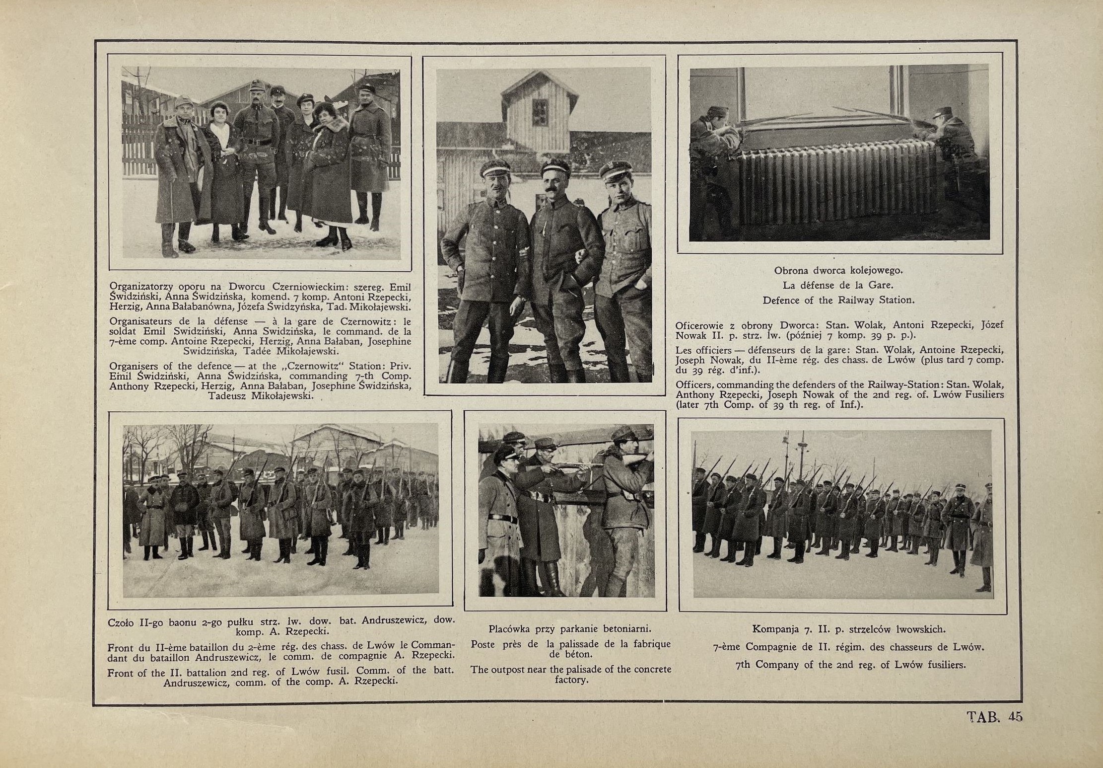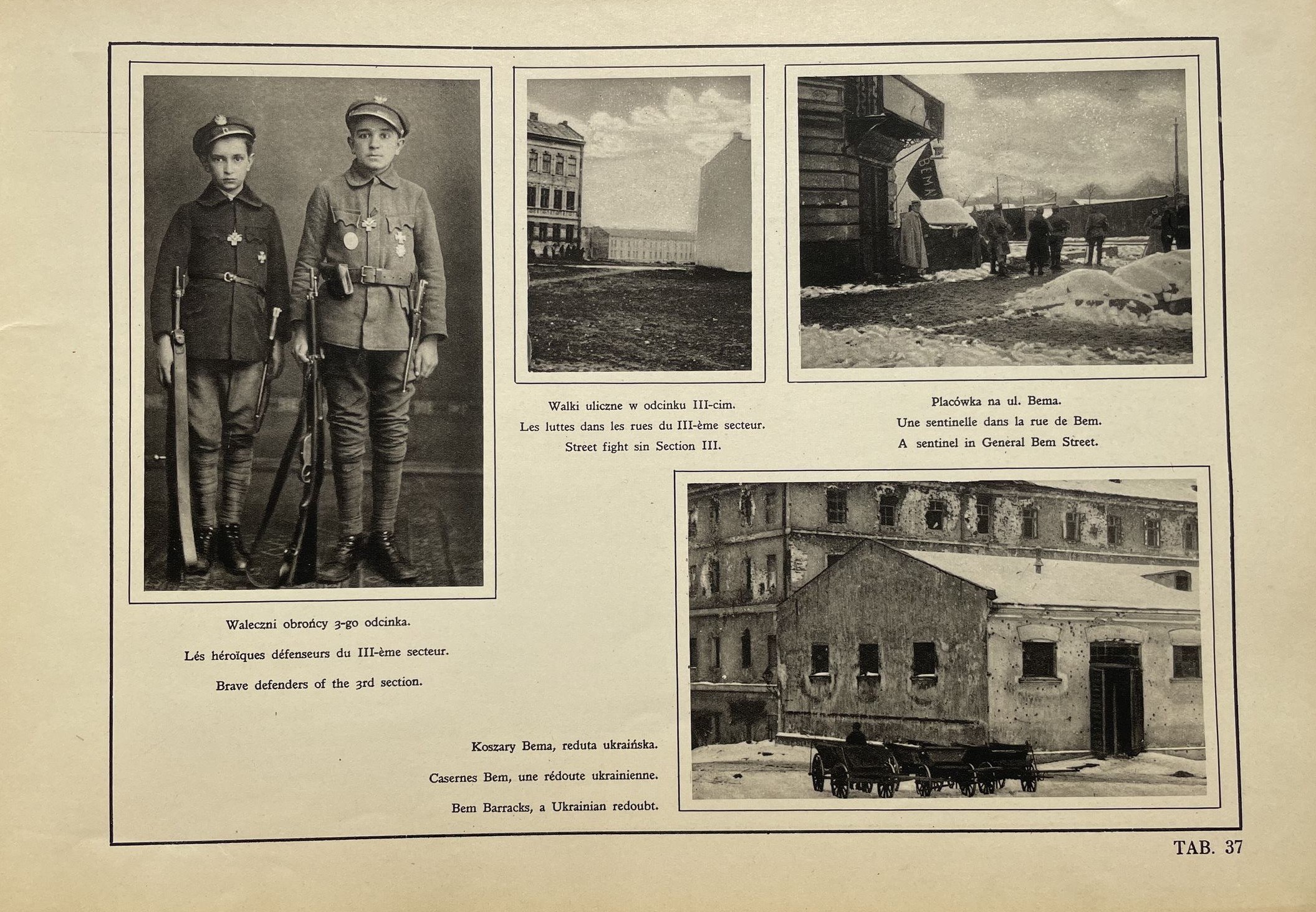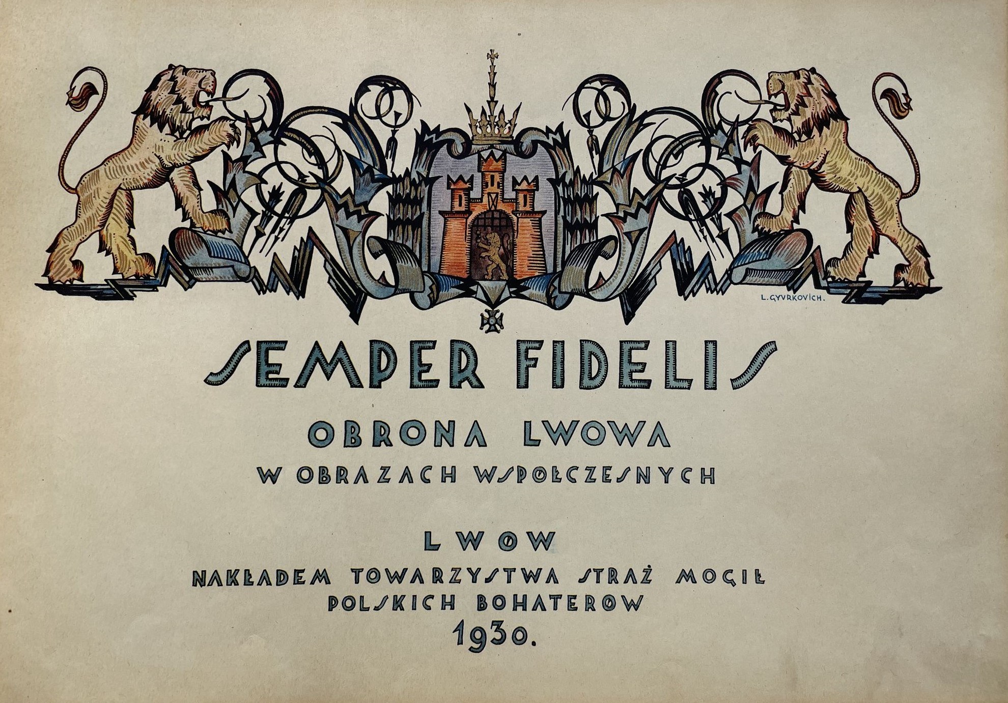 Semper Fidelis. Obrona Lwowa w obrazach współczesnych. Lwów 1930, nakł. Tow. Straż Mogił Polskich Bohaterów. 25 x 36 cm, str. X, 238, [2], w tym 236 tablic. ilustr. Barwna karta tyt. sygn. L. Gyvrkovich. Oprawa wyd. pł. złoc., niew. podklejenia krawędzi grzb., poza tym stan b. dobry.
