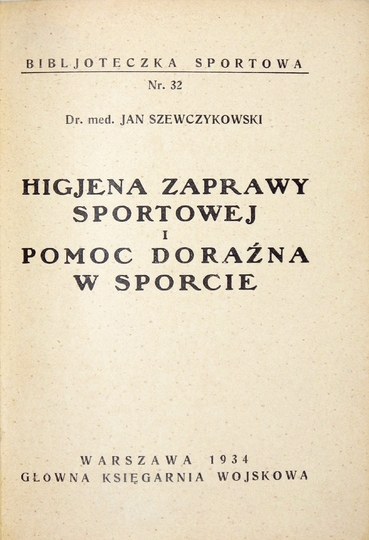 SZEWCZYKOWSKI Jan - Higjena zaprawy sportowej i pomoc doraźna w sporcie. Warszawa 1934. Główna Księg. Wojskowa. 16d, s. 68, [2]. broszura. Bibljoteczka Sportowa, nr 32.
