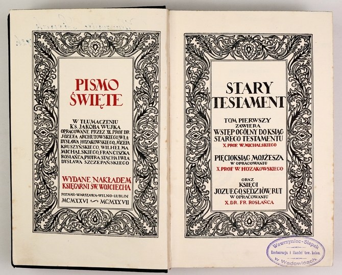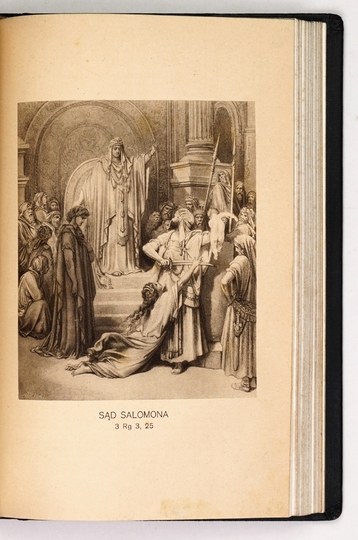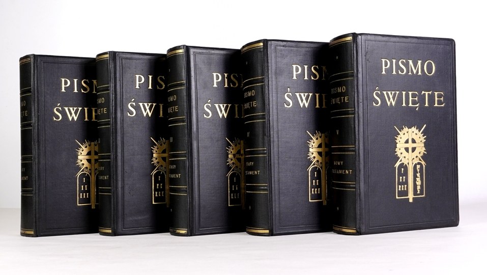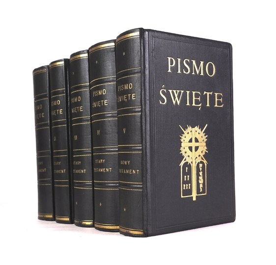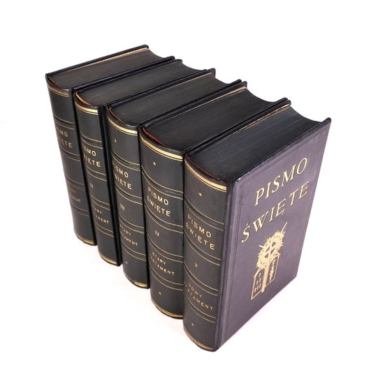Niewielkie zaplamienia, stan dobry. Piecz. międzywojennej restauracji w Kalwarii Zebrzydowskiej, podpisy własn. i zapiski jej właściciela (wynika z nich, że przeczytał całość w pierwszym roku okupacji). W każdym tomie ilustracje na tablicach. Numery tomów uwidocznione na grzbietach. T. 1-4: Stary Testament, t. 5: Nowy Testament.
