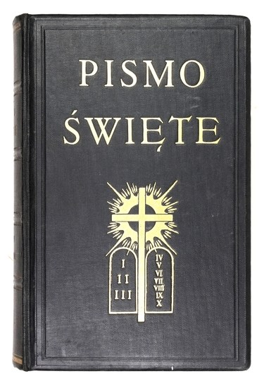 [BIBLIA]. Pismo Święte w tłumaczeniu ks. Jakuba Wujka, oprac. przez [...] J. Archutowskiego, W. Hozakowskiego, J. Kruszyńskiego [...]. [T. 1-5]. Poznań 1926-1932. Księg. św. Wojciecha. 8, s. XIII, [3], 656, [1]; VIII, 517; VIII, 690; VIII, 765; XII, 666, mapa rozkł. 1, plan 1. opr. oryg. pł. złoc., obcięcie barwione.