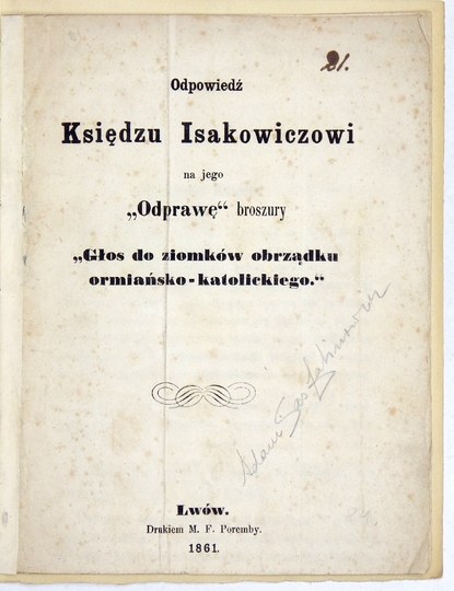 [TOROSIEWICZ Michał] - Odpowiedź Księdzu Isakowiczowi na jego "Odprawę" broszury "Głos do ziomków obrządku ormiańsko-katolickiego". Lwów 1861. Druk M. F. Poremby. 8, s. 11. brosz. wt.