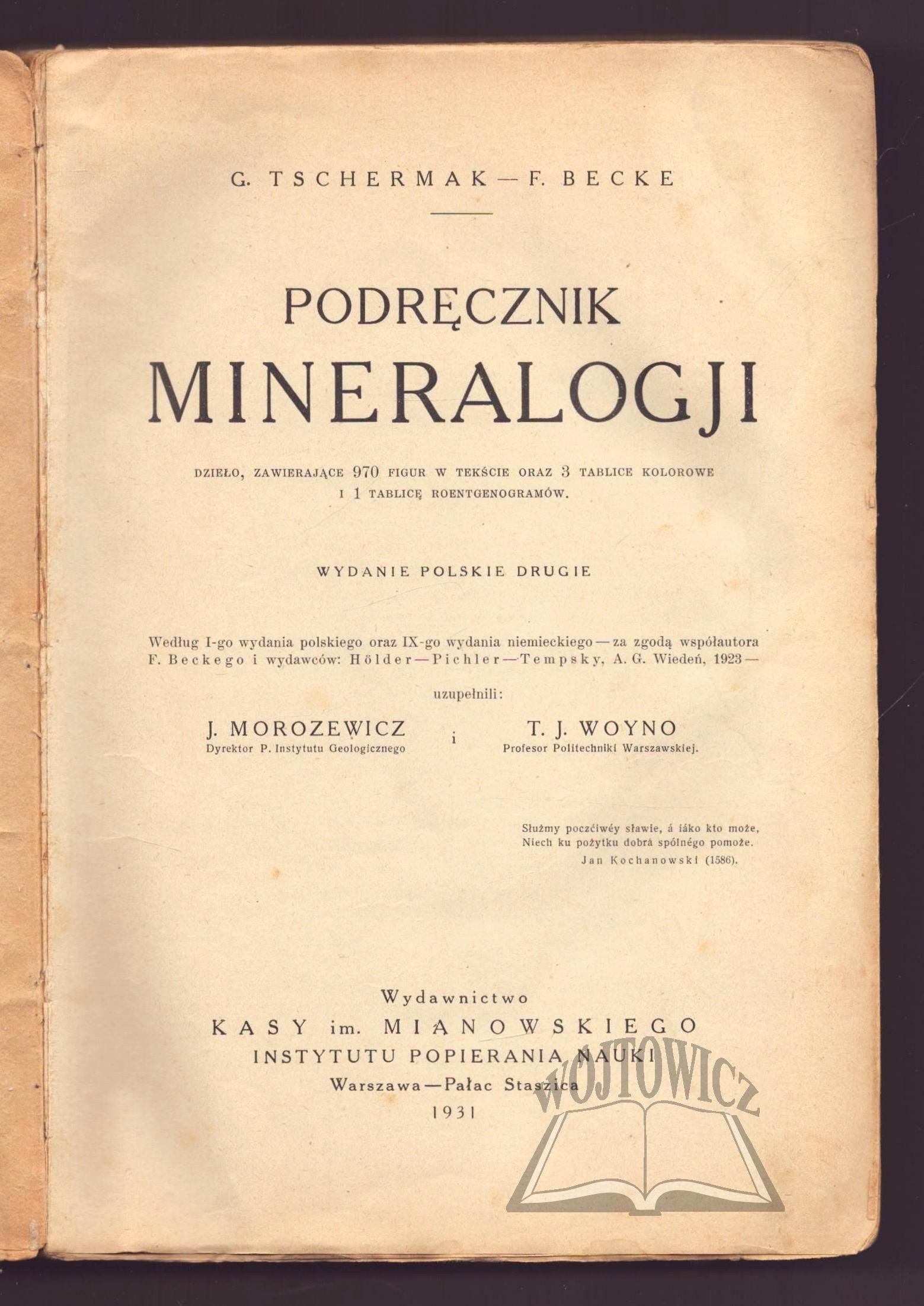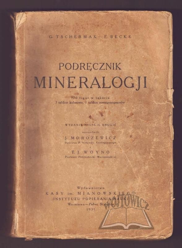 Mocne otarcia i zabrudz., niew. naddarcie okł. Niew. zaplam. kart. Egz. nieprzycięty. Stan dobry. Zawiera m. in.: Morfologja; Mineralogja fizyczna; Mineralogja chemiczna; Pokładoznawstawo (topika minerałów); Geneza minerałów (minerogenja); Systematyka; Pierwiastki; Lampryty; Tlenki; Solowce; Węglowce i inne.