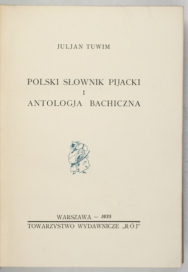 TUWIM Juljan - Polski słownik pijacki i antologja bachiczna. Warszawa 1935. Towarzystwo Wydawnicze "Rój". 8, s. 303, [1], tabl. 8. opr. oryg. pł., futerał kart.