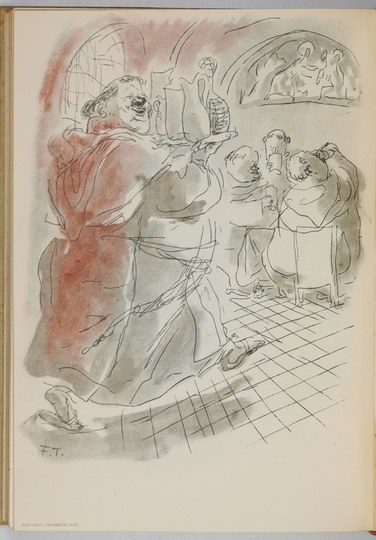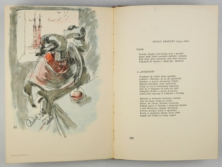 Niewielkie miejscowe zażółcenia okł., stan ogólny dobry. Pierwsze wydanie słynnego słownika z ilustracjami (na tablicach i w tekście) Feliksa Topolskiego. Książka zawiera wstęp autora, słownik pijacki (podający liczne synonimy m.in. wyrażeń: pić, wódka, stan i stopień nietrzeźwości, pijak, pogwarki i okrzyki pijackie, miary i naczynia) oraz antologię tekstów literackich poświęconych piciu alkoholu (z piosenek ludowych i mieszczańskich, z tekstów M. Reja, J. Kochanowskiego, W. Potockiego, I. Krasickiego). Na końcu reprodukowany tekst drukowany w kolumnie w kształcie butelki.