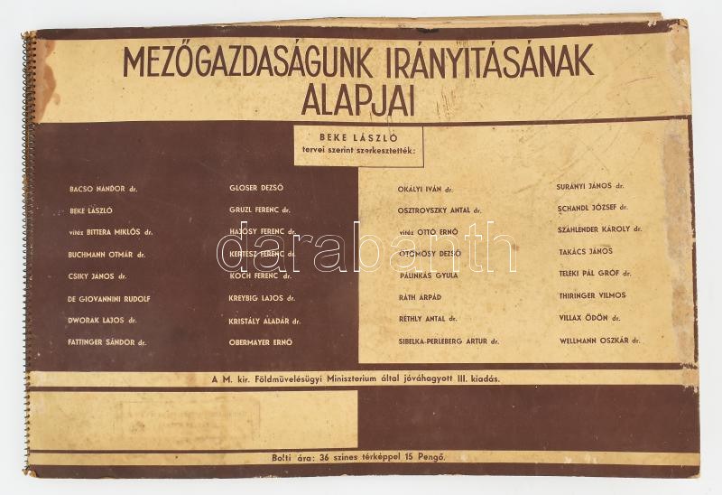 1941 Mezőgazdaságunk irányításának alapjai. Szerk.: Beke László. Bp., Magyar Királyi Földművelésügyi Minisztérium. III. kiadás. Különféle statisztikai térképek magyarázó szövegekkel. Spriálozott papírkötés, kissé foltos borítóval Folio