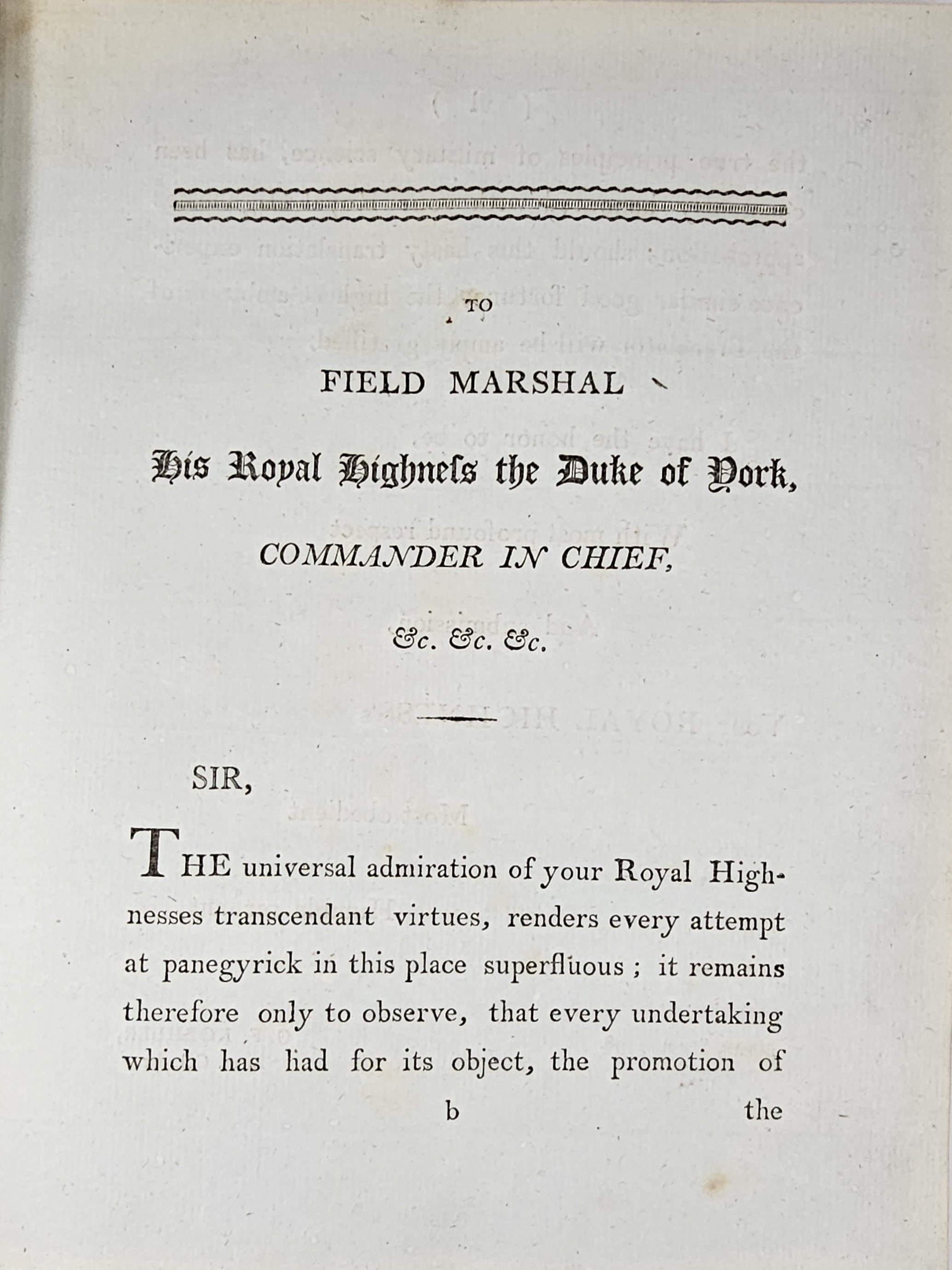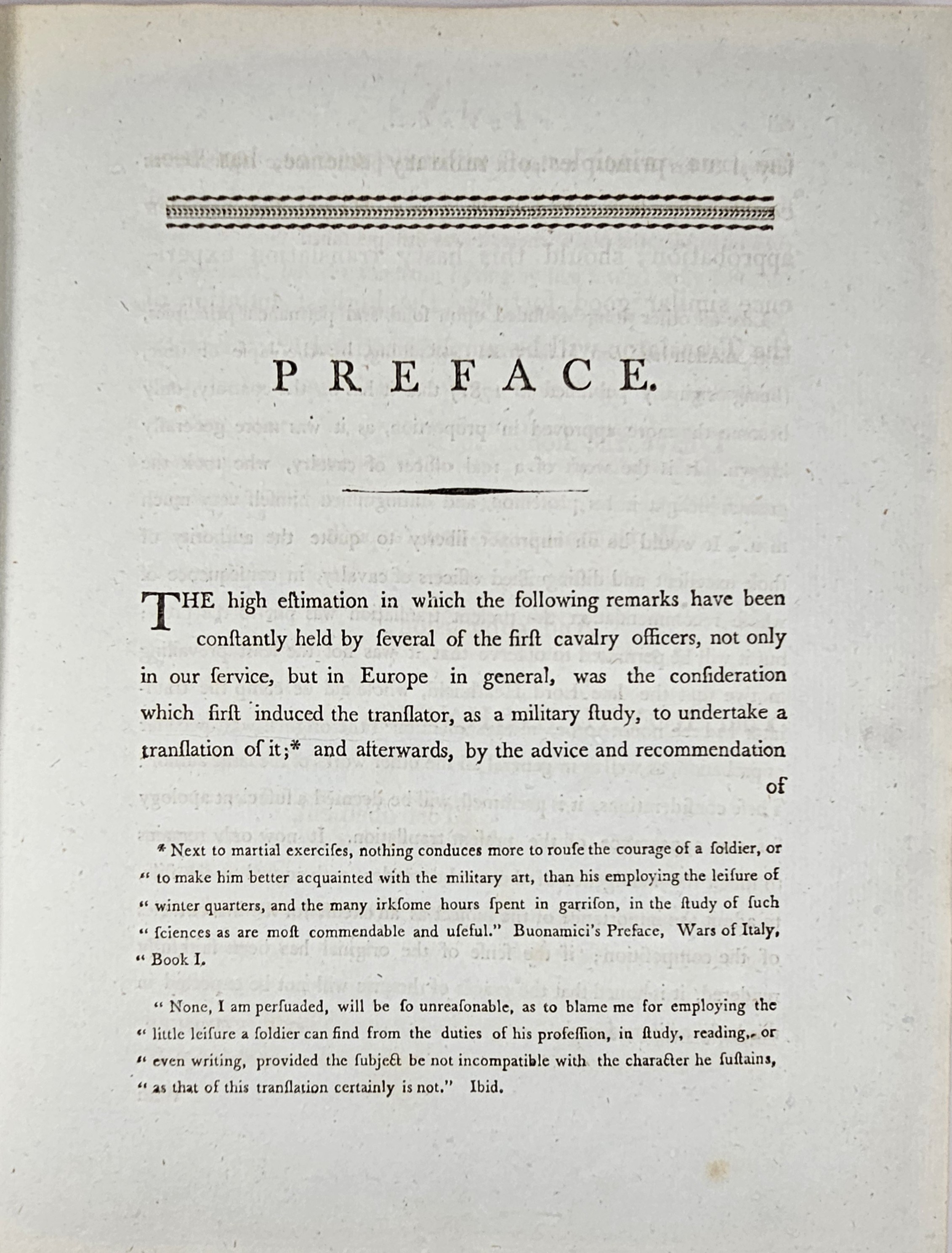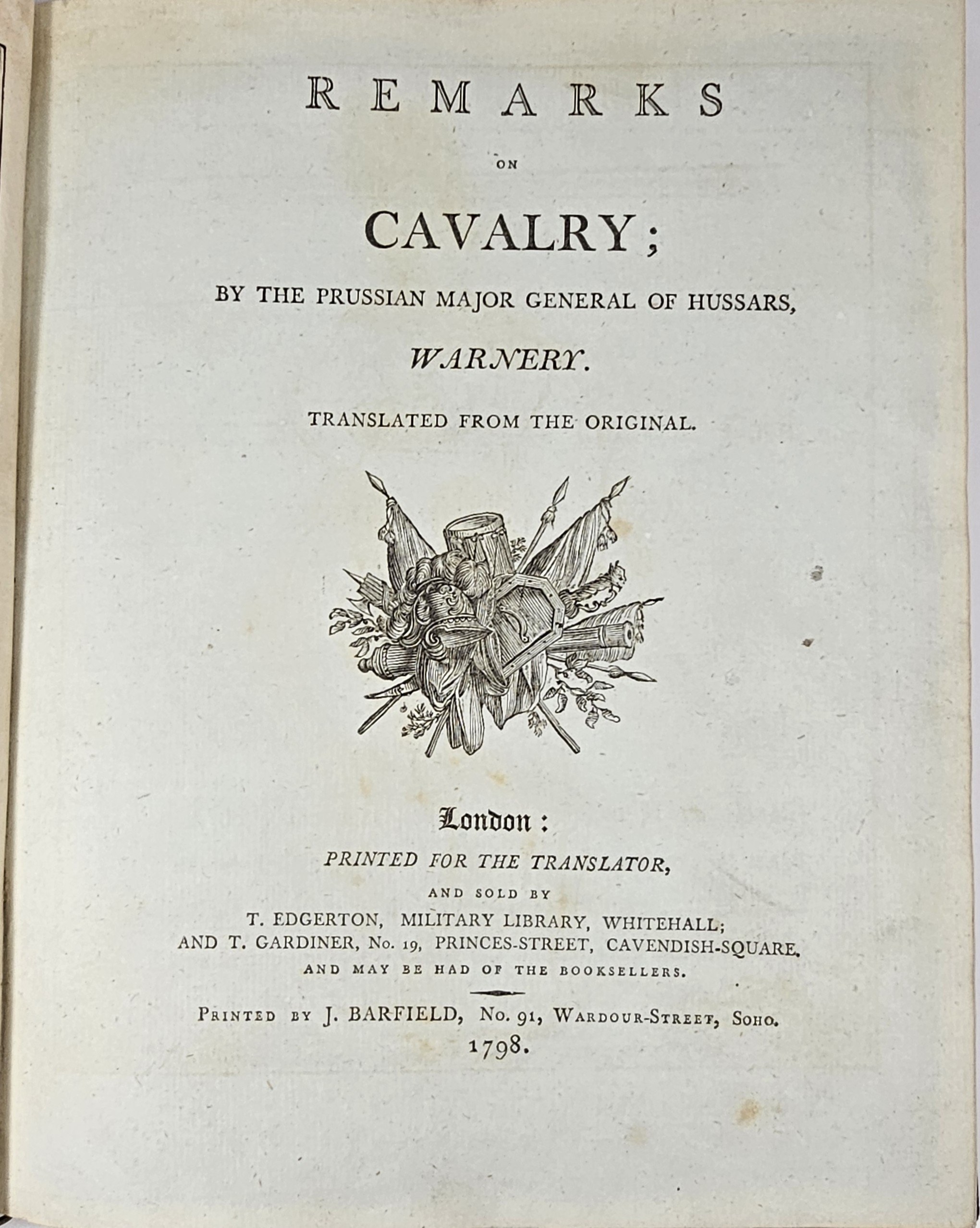 27.5 cm, s. XXII, 125, [1], 30 tablic, opr. sk. z epoki:grzbiet złocony z zielonym szyldzikiem; tekst na czerpanym niebieskim papierze, tablice na papierze welinowym. Grzbiet oprawy naprawiany, tablice ze śladami zabrązowień, poza tym stan dobry, ładny egzemplarz. Autor (1720-1786) historyk wojskowości, służył w wojsku Fryderyka II Wielkiego króla Prus, brał udział w wojnie siedmioletniej. W 1758 przeniósł się do Polski, gdzie osiągnął stopień generała-majora [Wikipedia].