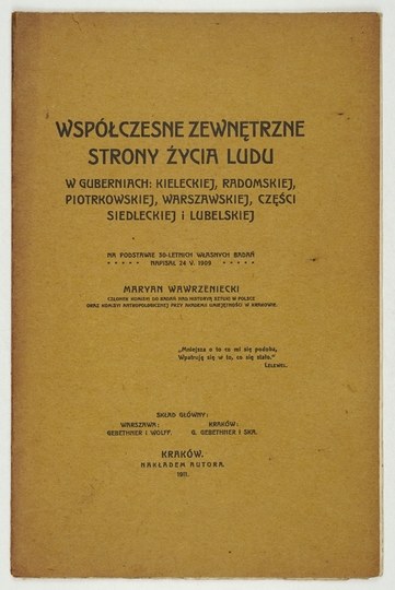 WAWRZENIECKI Maryan - Współczesne zewnętrzne strony życia ludu w guberniach: kieleckiej, radomskiej, piotrkowskiej, warszawskiej, części siedleckiej i lubelskiej. na podstawie 30-letnich własnych badań napisał 24. V. 1909 ... Kraków 1911. Nakł. autora. 4, s. 20. brosz. wt. z zach. okł. brosz.